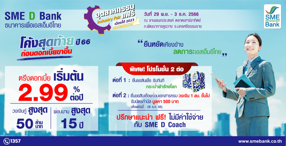 SME D Bank ล่องใต้ร่วมทัพ ‘อุตสาหกรรมแฟร์’ เมืองคอน จัดแคมเปญหนุนเอสเอ็มอีเข้าถึงสินเชื่อดอกเบี้ยพิเศษคู่โปรแกรมเสริมแกร่งธุรกิจ