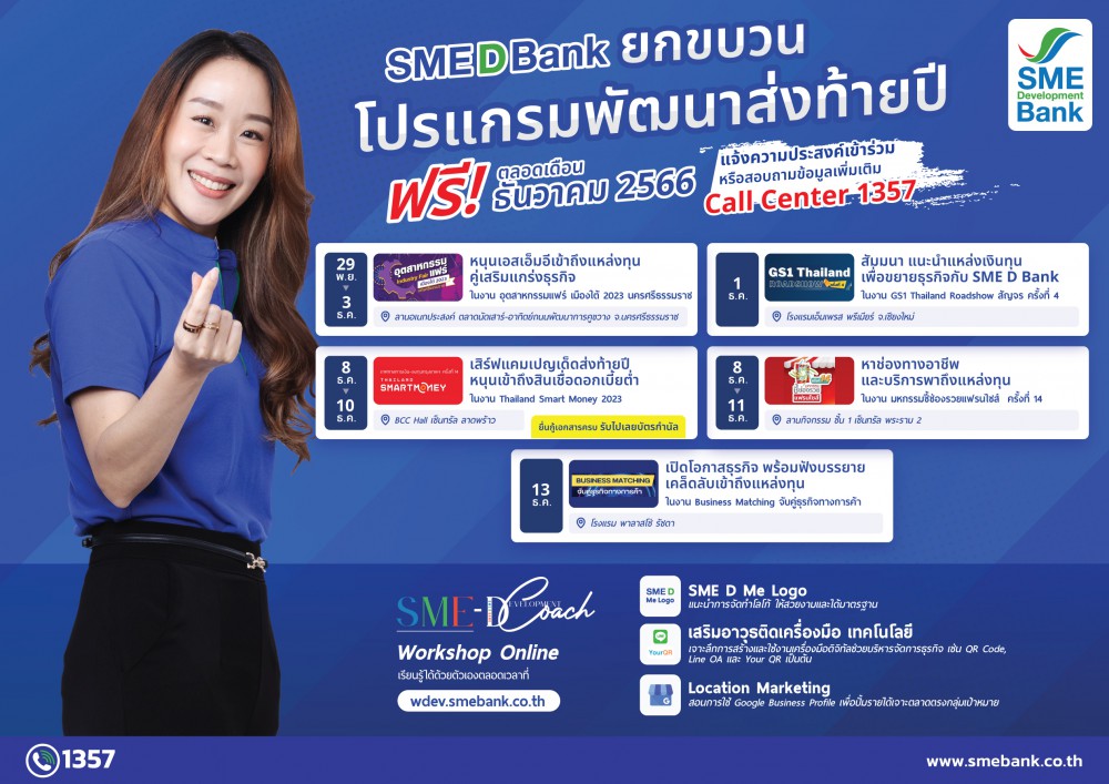 ธนาคารพัฒนาวิสาหกิจขนาดกลางและขนาดย่อมแห่งประเทศไทย (ธพว.) หรือ SME D Bank ธนาคารเพื่อเอสเอ็มอีไทย สนับสนุนผู้ประกอบการเอสเอ็มอีเดินหน้าธุรกิจ ยกขบวนเติมความรู้ ตอบครบทุกความต้องการ ตลอดเดือนธันวาคม 2566 ช่วยเพิ่มขีดความสามารถ ขยายตลาด สร้างโอกาสธุรกิจ ก้าวสู่ความสำเร็จอย่างยั่งยืน ทุกโปรแกรมรับบริการ ฟรี สมัครร่วมกิจกรรมหรือสอบถามข้อมูลเพิ่มเติม Call CENTER 1357