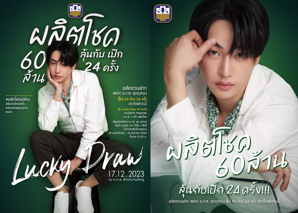 ธ.ก.ส. เปิดตัวพรีเซนเตอร์ ‘เป๊ก ผลิตโชค อายนบุตร’ พร้อมชวนร่วมกิจกรรมผลิตโชคชวนฟินกับถุงทอง เพียงฝากสลาก ธ.ก.ส. ชุดถุงทอง ตั้งแต่ 2,000 บาทขึ้นไป โดยทุก ๆ 2,000 บาท จะได้รับ 1 สิทธิ์ในการลุ้น Lucky Draw สำหรับเข้าร่วมกิจกรรมเปิดตัวพรีเซนเตอร์ในวันที่ 17 ธันวาคม 2566 แถมยังได้รับสิทธิ์ลุ้นรางวัล Grand Prize ถึง 60 ล้าน และรางวัลอื่น ๆ รวมมูลค่าสูงสุดต่องวด 77,650,000 บาท โดยสลากทุก ๆ หน่วย ลุ้นรางวัลได้ 24 ครั้ง อย่าลืม! กดติดตาม Facebook ธกส BAAC Thailand และ Line OA BAAC Family ไว้แล้วเตรียมพบกับกิจกรรมร่วมสนุกอีกมากมายกับเป๊ก ผลิตโชค ตลอดปี 2567