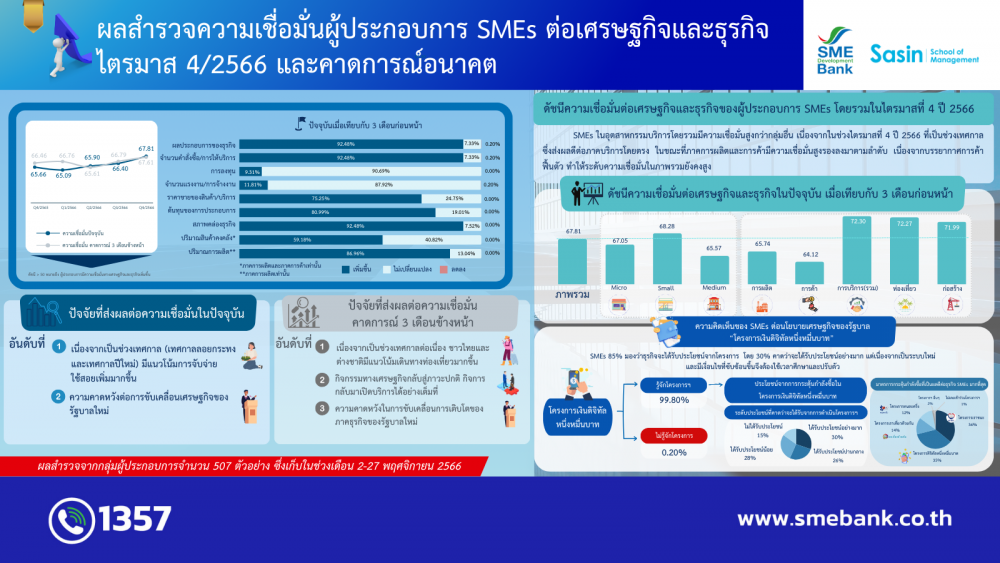 นางสาวนารถนารี รัฐปัตย์ กรรมการผู้จัดการ ธนาคารพัฒนาวิสาหกิจขนาดกลางและขนาดย่อมแห่งประเทศไทย (ธพว.) หรือ SME D Bank เผยว่า “ศูนย์วิจัยและข้อมูล ธพว.” และ “ศูนย์วิจัยและให้คำปรึกษา” สถาบันบัณฑิตบริหารธุรกิจศศินทร์แห่งจุฬาลงกรณ์มหาวิทยาลัย ร่วมสำรวจความเชื่อมั่นผู้ประกอบการเอสเอ็มอีต่อเศรษฐกิจและธุรกิจ ประจำไตรมาส 4/2566 และคาดการณ์อนาคต จากจำนวนผู้ประกอบการเอสเอ็มอีกว่า 500 ตัวอย่างทั่วประเทศ ครอบคลุมทุกประเภทอุตสาหกรรม พบว่า ดัชนีความเชื่อมั่นต่อเศรษฐกิจและธุรกิจของผู้ประกอบการเอสเอ็มอี ในไตรมาส 4/2566 อยู่ที่ระดับ 67.81 ปรับตัวสูงขึ้นเล็กน้อย เมื่อเทียบกับไตรมาสที่ 3/2566 ที่ผ่านมา ซึ่งอยู่ในระดับ 66.40 เนื่องจากอยู่ในช่วงเทศกาลลอยกระทง และเทศกาลปีใหม่ ทำให้มีแนวโน้มการจับจ่ายใช้สอยเพิ่มขึ้น ประกอบกับความคาดหวังต่อการขับเคลื่อนเศรษฐกิจของรัฐบาล