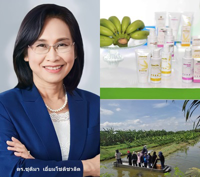 พัฒนาและยกระดับการแปรรูปผลิตภัณฑ์จากสารสกัดข้าวหอมปทุมธานี กล้วยหอมปทุม และบัวหลวง โดยนำเปลือกกล้วยหอมทอง กลีบบัวหลวงและข้าวหอมปทุมธานี 1 งอก มาเป็นวัตถุดิบในการสกัดสารและพัฒนาเป็นผลิตภัณฑ์เครื่องสำอาง ในกลุ่มของเซรั่ม ครีม โลชั่น สครับ สบู่ แชมพู และโทนเนอร์ พร้อมทั้งออกแบบฉลากสินค้าและวัสดุบรรจุของผลิตภัณฑ์ ดำเนินการจดแจ้งผลิตภัณฑ์เครื่องสำอาง 21 ผลิตภัณฑ์ และผลิตสินค้าสำเร็จรูปพร้อมจำหน่ายเชิงพาณิชย์