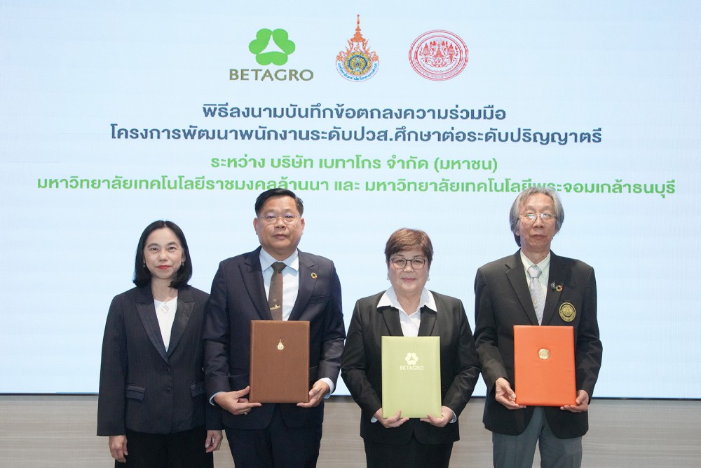 บริษัท เบทาโกร จำกัด (มหาชน)” โดย “ดร.ถนอมวงศ์ แต้ไพสิฐพงษ์” (ที่ 3 จากซ้าย) ประธานเจ้าหน้าที่ กลุ่มงานบริหารส่วนกลาง ลงนามบันทึกข้อตกลงความร่วมมือโครงการพัฒนาพนักงานระดับประกาศนียบัตรวิชาชีพชั้นสูง (ปวส.) ศึกษาต่อในระดับปริญญาตรี ในรูปแบบโรงเรียนในโรงงานผ่านการวิจัยและพัฒนาระบบการศึกษาไตรภาคี ร่วมกับ “มหาวิทยาลัยเทคโนโลยีราชมงคลล้านนา (มทร.ล้านนา)” โดย “ผศ.จัตตุฤทธิ์ ทองปรอน” (ที่ 2 จากซ้าย) รักษาราชการแทนอธิการบดี และ “มหาวิทยาลัยเทคโนโลยีพระจอมเกล้าธนบุรี (มจธ.)” โดย “รศ.สุวิทย์ แซ่เตีย” (ที่ 4 จากซ้าย) อธิการบดี