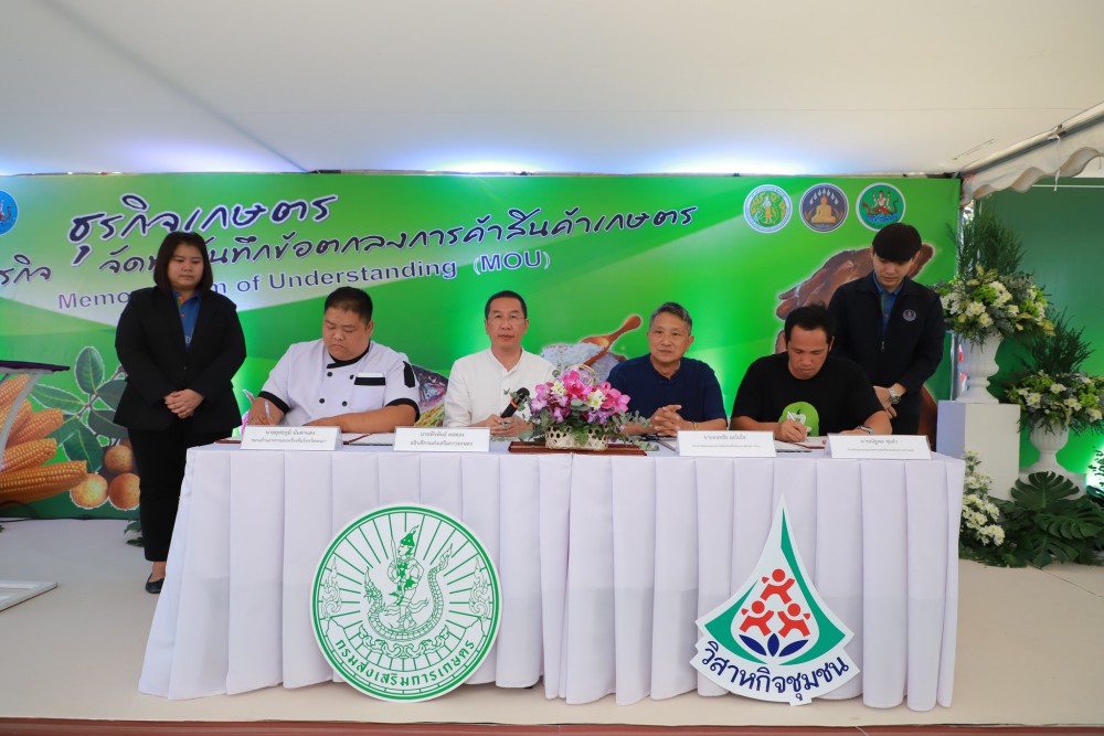 นายพีรพันธ์ คอทอง อธิบดีกรมส่งเสริมการเกษตร กล่าวว่า กรมส่งเสริมการเกษตร ขับเคลื่อนนโยบาย“ตลาดนำ นวัตกรรมเสริมเพิ่มรายได้” โดยส่งเสริมสนับสนุนการจัดทำบันทึกข้อตกลง (MOU) ว่าด้วยความร่วมมือด้านการสนับสนุนผลผลิตทางการเกษตรของวิสาหกิจชุมชน ระหว่าง “ชมรมร้านอาหารและเครื่องดื่มจังหวัดพะเยา” และ “วิสาหกิจชุมชนกลุ่มอนุรักษ์ผลิตภัณฑ์ลิ้นจี่คุณภาพห้วยป่ากล้วย” “วิสาหกิจชุมชนกลุ่มเกษตรกรผลิตพืชปลอดภัยตำบลบ้านเหล่า” “วิสาหกิจชุมชนศูนย์ส่งเสริมและผลิตภัณฑ์ข้าวชุมชนตำบลจุน” ณ งานมหกรรมการเกษตรและท่องเที่ยวถนนสายดอกไม้งามริมกว๊านพะเยา จังหวัดพะเยา