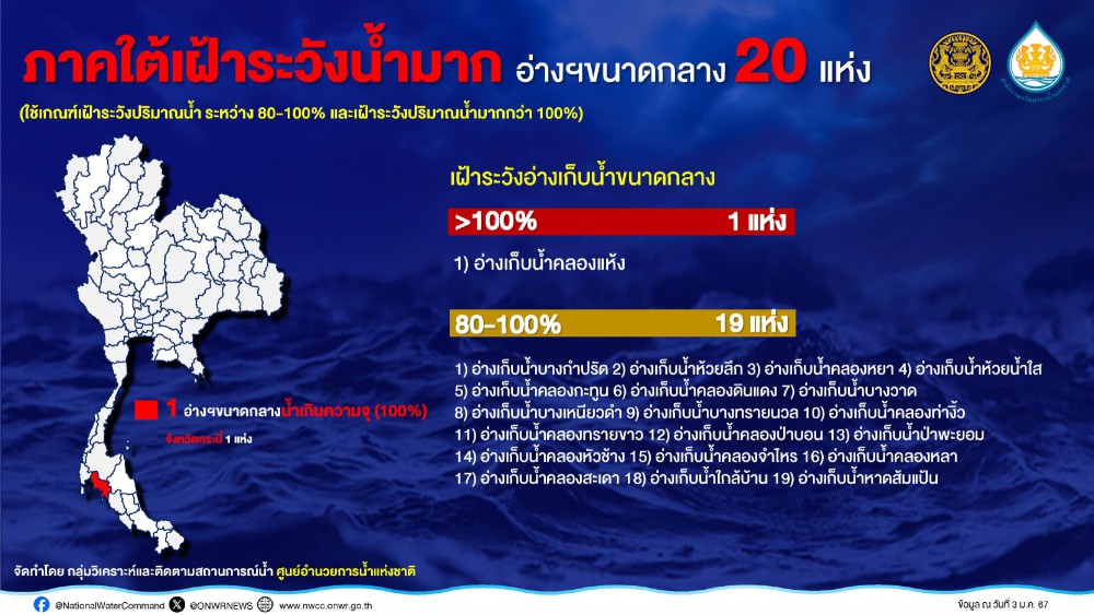 สำหรับสถานการณ์น้ำในแหล่งน้ำทั่ วประเทศ ปัจจุบันมีปริมาณน้ำ 61,297 ล้านลูกบาศก์เมตร (ลบ.ม.) หรือคิดเป็น 74% ของความจุรวม โดยเป็นน้ำใช้การ 37,085 ล้าน ลบ.ม. หรือคิดเป็น 64% ของความจุน้ำใช้การ โดยปัจจุบันประเทศไทยยังเผชิญกั บสภาวะเอลนีโญกำลังแรง ส่งผลให้พื้นที่ ตอนบนของประเทศไทย ตั้งแต่ภาคเหนือ ภาคตะวันออกเฉียงเหนือ ภาคตะวันออก ภาคกลาง และภาคใต้ตอนบน มีปริมาณฝนน้อยจนถึงไม่มีเลย ขณะเดียวกัน การใช้น้ำตั้งแต่ช่วงต้นฤดูแล้ งที่ผ่านมา ทำให้ปริมาณน้ำในแหล่งน้ำต่าง ๆ เริ่มมีจำนวนลดน้อยลง ซึ่งจากการประเมินแหล่งน้ำ ขนาดใหญ่-ขนาดกลาง พบว่า มีแหล่งน้ำเฝ้าระวังน้ำน้อย 96 แห่ง โดยเป็นอ่างฯ ขนาดใหญ่ 3 แห่ง ได้แก่ อ่างฯสิริกิติ์ อ่างฯกระเสียว และอ่างฯคลองสียัด ซึ่งจะมีการเฝ้าระวังอย่างต่ อเนื่องและบริหารจัดการน้ำอย่ างรอบคอบเพื่อให้เพียงพอต่ อความต้องการใช้น้ำในพื้นที่