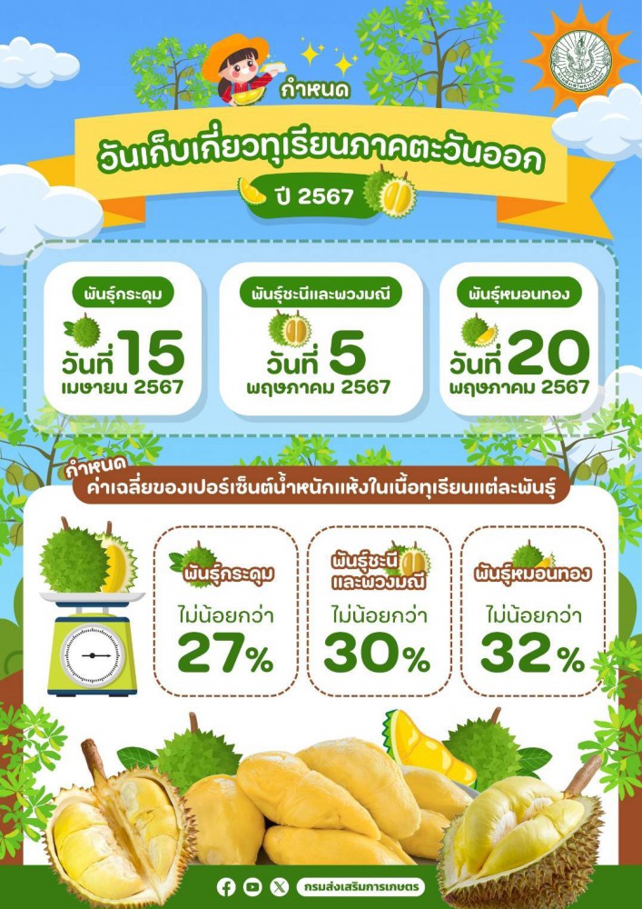ทั้งนี้เพื่อใช้เป็นกรอบระยะเวลาในการดำเนินงานตามมาตรการฯและให้ผลผลิตทุเรียนที่ออกสู่ตลาดมีคุณภาพ คือ พันธุ์กระดุม วันที่ 15 เมษายน 2567 พันธุ์ชะนี และพวงมณี วันที่ 5 พฤษภาคม 2567 พันธุ์หมอนทอง วันที่ 20 พฤษภาคม 2567 โดยได้กำหนดค่าเฉลี่ยของเปอร์เซ็นต์น้ำหนักแห้งในเนื้อทุเรียนแต่ละสายพันธุ์ไว้ ดังนี้ 1) พันธุ์กระดุม ไม่น้อยกว่า 27 เปอร์เซ็นต์ 2) พันธุ์ชะนี
