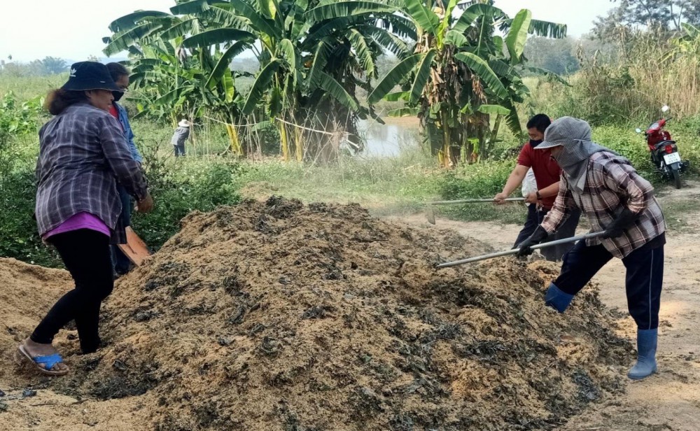 ทั้งเพื่อทดสอบดูว่าไม่ให้เปียกหรือแห้งเกินไป ถ้าแห้งเกินไปให้นำน้ามารดเพิ่มบนกองปุ๋ยหมัก และใช้จอบคลุกเคล้าไปเรื่อย ๆ จากนั้น นำปุ๋ยยูเรีย 2 กิโลกรัม มาคลุกเคล้ากับกองปุ๋ยหมัก ใช้จอบคลุกเคล้าให้เข้ากัน แล้วกลับกองปุ๋ยหมักพร้อมรดน้ำทุก ๆ 7 วัน เมื่อครบ 1 เดือน ก็สามารถนำมาใส่ในแปลงหม่อนได้ โดยใส่รอบ ๆ ทรงพุ่ม หลังการตัดแต่งกิ่งหม่อน