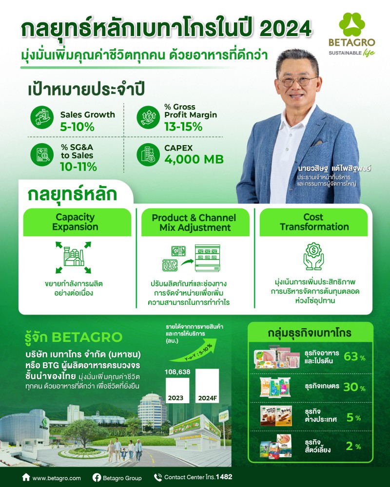 บริษัท เบทาโกร จำกัด (มหาชน) หรือ “BTG” เปิดกลยุทธ์ 2024 ขับเคลื่อนธุรกิจ มุ่งสร้างการเติบโตที่มั่นคงและยั่งยืน ด้วยการขยายกำลังการผลิต ปรับพอร์ตสินค้าและช่องทางการจัดจำหน่าย เน้นบริหารจัดการต้นทุน พร้อมเดินหน้าทรานส์ฟอร์มองค์กร ดึงผู้บริหารวิสัยทัศน์ไกลเสริมทัพธุรกิจสร้างความแข็งแกร่ง โดยขับเคลื่อนธุรกิจตามกรอบ ESG มุ่งสู่ความยั่งยืนทุกภาคส่วน วางเป้าหมายปี 2567 เติบโต 5-10%