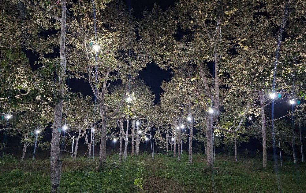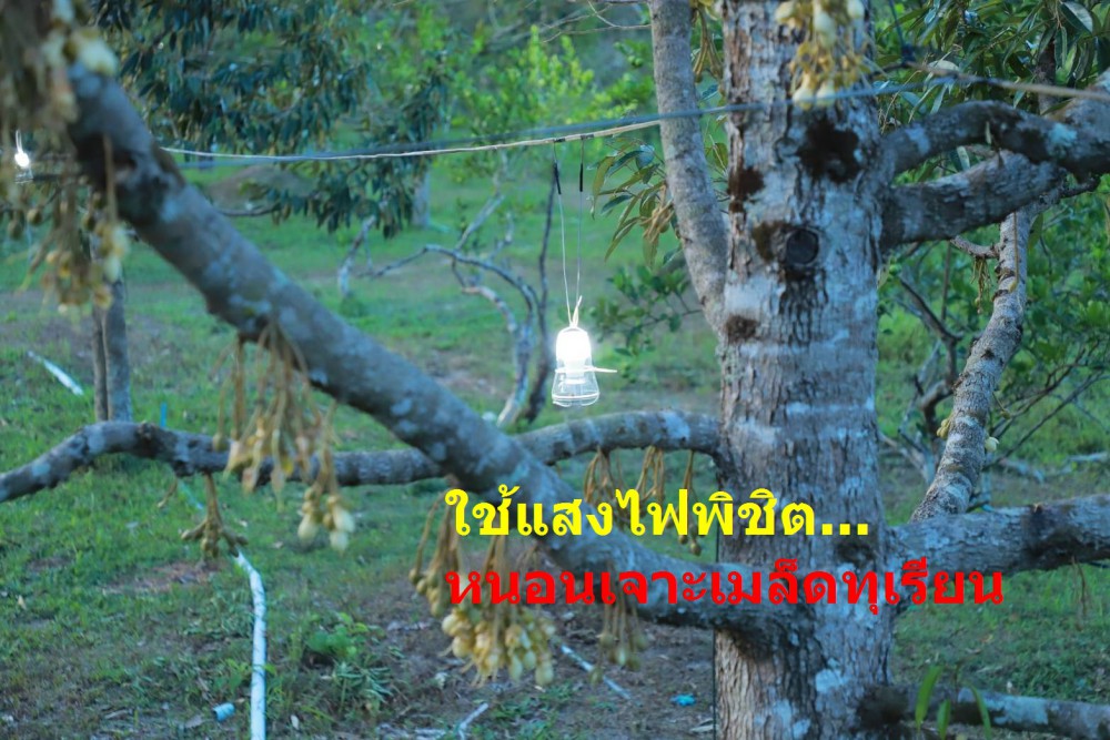 ทั้งนี้ได้สังเกตว่าต้นทุเรียนที่อยู่ใกล้เสาไฟฟ้าริมถนน ผลผลิตเสียหายจากหนอนเจาะเมล็ดทุเรียนน้อยมาก จึงคิดว่าแสงไฟน่าจะมีผลต่อหนอนเจาะเมล็ดทุเรียน ซึ่งแม่ของหนอนเจาะเมล็ดทุเรียน คือ ผีเสื้อกลางคืน ซึ่งจะบินจากพื้นดินขึ้นไปวางไข่ที่ผลทุเรียนตอนกลางคืน ดังนั้น เมื่อต้นทุเรียนอยู่ที่สว่าง การวางไข่จึงน้อยกว่าสวนทั่วไปที่อยู่ในที่มืด จากข้อสันนิษฐานดังกล่าวจึงได้เริ่มทดลองติดหลอดไฟที่ต้นทุเรียนตั้งแต่ปี 2558 พบว่าปัญหาทุเรียนรูลดลง จึงเพิ่มพื้นที่ใช้แสงไปในสวนทุเรียนทั้งหมด 15 ไร่