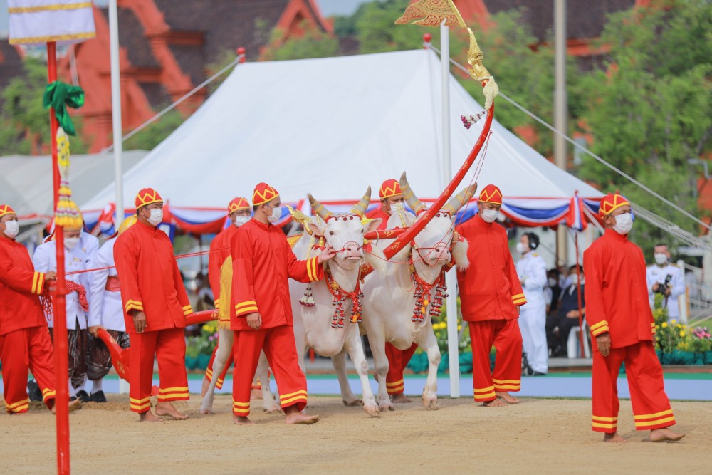 เมื่อเสร็จสิ้นขั้นตอนการไถแล้วจะเป็นการเสี่ยงทายของกิน 7 สิ่งตั้งเลี้ยงพระโค ได้แก่ ข้าวเปลือก ข้าวโพด ถั่วเขียว งา เหล้า น้ำและหญ้า เมื่อพระโคกินของสิ่งใดโหรหลวงจะถวายคำพยากรณ์ ดังนี้ ถ้าพระโคกินข้าวหรือข้าวโพด พยากรณ์ว่า ธัญญาหาร ผลาหาร จะบริบูรณ์ดี ถ้าพระโคกินถั่วหรืองา พยากรณ์ว่า ผลาหาร ภักษาหารจะอุดมสมบูรณ์ดี ถ้าพระโคกินน้ำหรือหญ้า พยากรณ์ว่า น้ำท่าจะบริบูรณ์พอสมควร ธัญญาหารผลาหาร ภักษาหาร มังสาหารจะอุดมสมบูรณ์ดี และถ้าพระโคกินเหล้า พยากรณ์ว่า การคมนาคมสะดวกขึ้น การค้าขายกับต่างประเทศดีขึ้นทำให้เศรษฐกิจรุ่งเรือง
