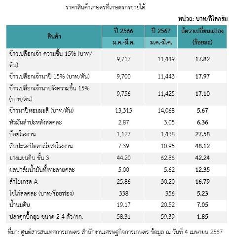 แม้ว่าภาพรวมภาวะเศรษฐกิจการเกษตรไตรมาส 1 จะหดตัวลง เนื่องจากผลผลิตสินค้าเกษตรหลายชนิดที่ลดลง แต่ราคาสินค้าเกษตรสำคัญส่วนใหญ่ปรับตัวสูงขึ้นอย่างเห็นได้ชัด โดยสินค้าที่มีราคาเฉลี่ยเพิ่มขึ้นในช่วงเดือนมกราคม – มีนาคม 2567 เมื่อเทียบกับช่วงเดียวกันของปี 2566 ได้แก่ ข้าว มันสำปะหลัง อ้อยโรงงาน สับปะรดปัตตาเวีย ยางพารา ปาล์มน้ำมัน และลำไย โดย ข้าว ราคาเพิ่มขึ้น เนื่องจากตลาดทั้งในประเทศและต่างประเทศยังคงมีความต้องการอย่างต่อเนื่อง มันสำปะหลัง ราคาเพิ่มขึ้น เนื่องจากอุตสาหกรรมการผลิตอาหารสัตว์และอุตสาหกรรมพลังงานภายในประเทศมีความต้องการต่อเนื่อง อ้อยโรงงาน ราคาเพิ่มขึ้น เนื่องจากความต้องการใช้ในอุตสาหกรรมน้ำตาลในประเทศเพิ่มขึ้น ประกอบกับราคาน้ำตาลในตลาดโลกปรับตัวสูงขึ้น ส่งผลให้ราคาอ้อยในประเทศสูงขึ้น สับปะรดปัตตาเวีย ราคาเพิ่มขึ้นจากความต้องการของโรงงานแปรรูปที่ยังมีอย่างต่อเนื่อง
