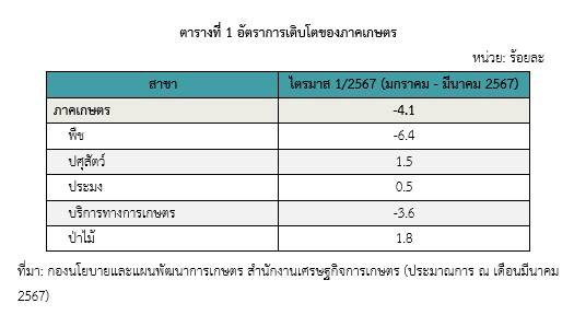 นายฉันทานนท์ วรรณเขจร เลขาธิการสำนักงานเศรษฐกิจการเกษตร (สศก.) กระทรวงเกษตรและสหกรณ์ เปิดเผยถึงภาวะเศรษฐกิจการเกษตรในไตรมาส 1 ปี 2567 (มกราคม – มีนาคม 2567) พบว่า หดตัวร้อยละ 4.1 เมื่อเทียบกับช่วงเดียวกันของปี 2566 โดยสาขาพืช ซึ่งเป็นสาขาการผลิตหลัก หดตัวร้อยละ 6.4 เนื่องจากได้รับผลกระทบจากปรากฏการณ์เอลนีโญ ที่เกิดขึ้นตั้งแต่ปี 2566 ต่อเนื่องมาถึงช่วงต้นปี 2567 ทำให้ปริมาณฝนน้อยกว่าปีที่ผ่านมา ปริมาณน้ำในอ่างเก็บน้ำสำคัญและแหล่งน้ำตามธรรมชาติลดลง บางพื้นที่เกิดภาวะฝนทิ้งช่วง และมีสภาพอากาศร้อนจัดอย่างต่อเนื่อง กระทบต่อพืชสำคัญหลายชนิดทำให้พืชเจริญเติบโตช้า ให้ผลผลิตน้อยลงและไม่สมบูรณ์ ทั้งนี้ สาขาพืชที่หดตัวค่อนข้างมาก