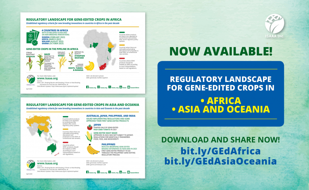 ข้อมูลเหล่านี้สรุปไว้ใน ISAAA Brief 56 ซึ่งเผยแพร่เมื่อเดือนธันวาคม พ.ศ. 2564 สื่อประสมนี้จะแสดงภาพรวมด้านกฎระเบียบทั่วโลกสำหรับพืชแก้ไข/ปรับแต่งยีนซึ่งได้มีการเผยแพร่เมื่อเดือนมกราคม พ.ศ. 2567 สื่อประสมใหม่อีก 2 ภาพมุ่งเน้นไปที่แอฟริกา เอเชีย และโอเชียเนีย รวมถึงแนวทางปฏิบัติล่าสุดของแต่ละประเทศและผลิตภัณฑ์ที่พัฒนาขึ้น โดยใช้ CRISPR และ TALEN ดาวน์โหลดสื่อประสมทั้ง 2 รายการได้ที่นี่ (bit.ly/GEdAfrica และ bit.ly/GEdAsiaOceania)