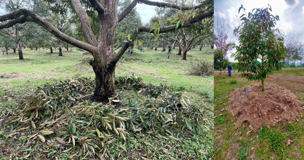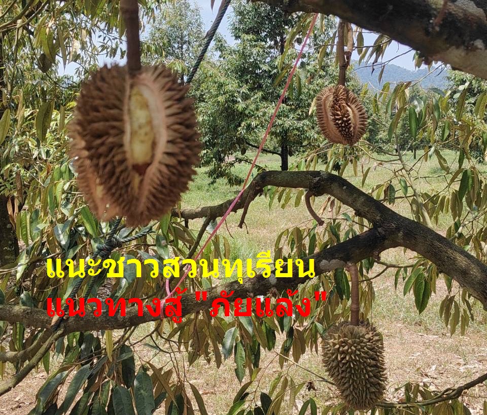 2.รักษาความชื้นในดิน โดยการคลุมดินด้วยเศษหญ้า หรือวัสดุคลุมโคนต้นทุเรียน 3.ไม่ให้ปุ๋ยที่มีไนโตรเจนสูง เพราะจะกระตุ้นให้พืชแตกใบอ่อนส่งผลให้มีการใช้น้ำมากขึ้น 4.ไว้ผลต่อต้นในปริมาณที่เหมาะสม ถ้ามีการติดผลมาก หากน้ำไม่เพียงพอแต่มีการติดผลมาก ต้องตัดผลทิ้งบางส่วน เพื่อให้ต้นอยู่รอด รวมทั้งตัดแต่งใบภายในทรงพุ่มออกเพื่อลดการคายน้ำ และ 5.พ่นด้วยสารเพื่อลดความรุนแรงจากอากาศร้อนและแล้ง เช่น พ่นสารเคโอลิน (Kaolin) หรือดินขาวเคโอลิน ในอัตรา Kaolin 6% w/v อัตรา 1 กก./น้ำ 200 ลิตร
