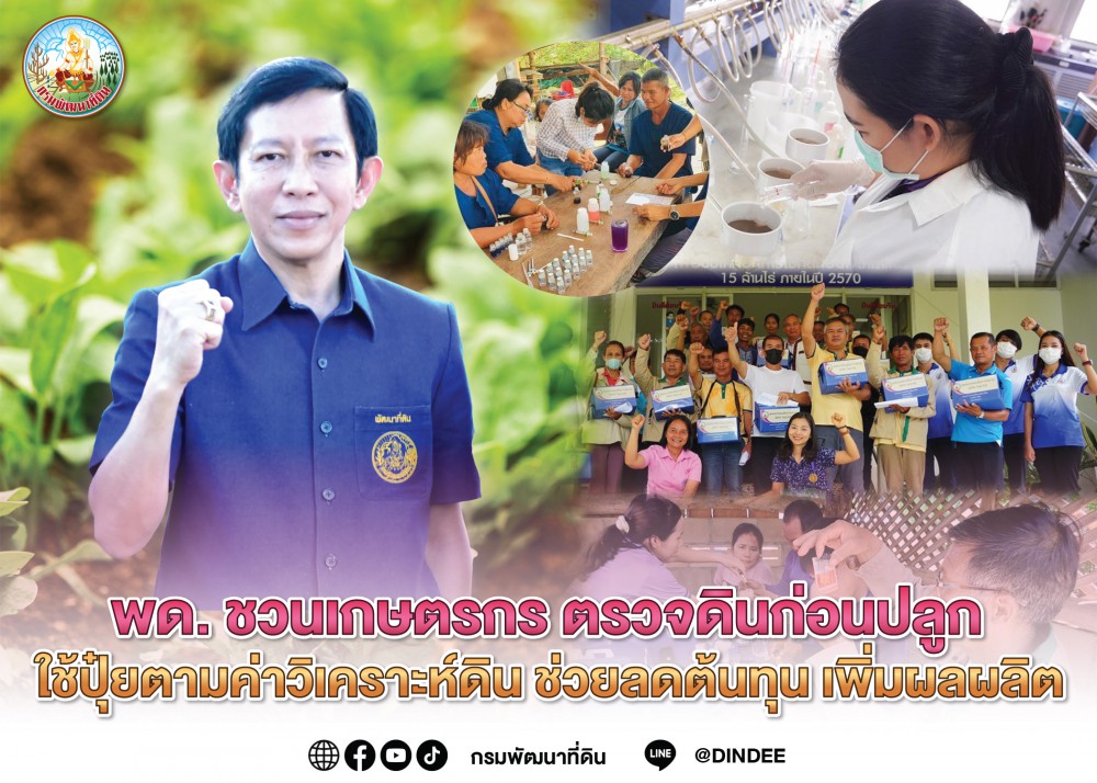 กรมพัฒนาที่ดิน ชวนเกษตรกร ตรวจดินก่อนปลูก ใช้ปุ๋ยตามค่าวิเคราะห์ดิน เพื่อให้ได้ดินที่มีความเหมาะสมต่อการปลูกพืช ช่วยลดต้นทุน เพิ่มผลผลิต เผยในปี 2566 มีเกษตรกรสนใจขอรับบริการตรวจวิเคราะห์ดินไม่ต่ำกว่า 15,000 ราย เผยหากเกษตรกรและประชาชนทั่วไปที่สนใจขอรับบริการตรวจวิเคราะห์ดิน ปัจจุบันมีห้องปฏิบัติการวิเคราะห์ดินให้บริการแล้ว13 แห่งทั่วประเทศ