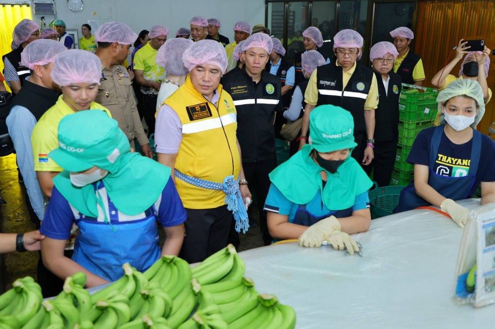 จากนั้นรัฐมนตรีว่าการกระทรวงเกษตรและสหกรณ์ และคณะ ได้เยี่ยมชมกระบวนการตัดแต่งและบรรจุกล้วยหอมทองเพื่อการส่งออก ณ สหกรณ์การเกษตรท่ายาง จำกัด ซึ่งปัจจุบันมีสมาชิกที่ลงทะเบียนปลูกกล้วยกับสหกรณ์ จำนวน 231 ราย มีเนื้อที่เพาะปลูกประมาณ 2,000 ไร่/ปี จำหน่ายทั้งตลาดในประเทศและตลาดต่างประเทศ แบ่งเป็น ตลาดในประเทศประมาณ 4,000 ตันต่อปี มีจำหน่ายที่ 7-11, Tops, Big C, Fuji supercenter และ Foodland เป็นต้น ส่วนตลาดต่างประเทศที่สำคัญ คือ ประเทศญี่ปุ่น ส่งออกประมาณ 200 ตัน/ปี
