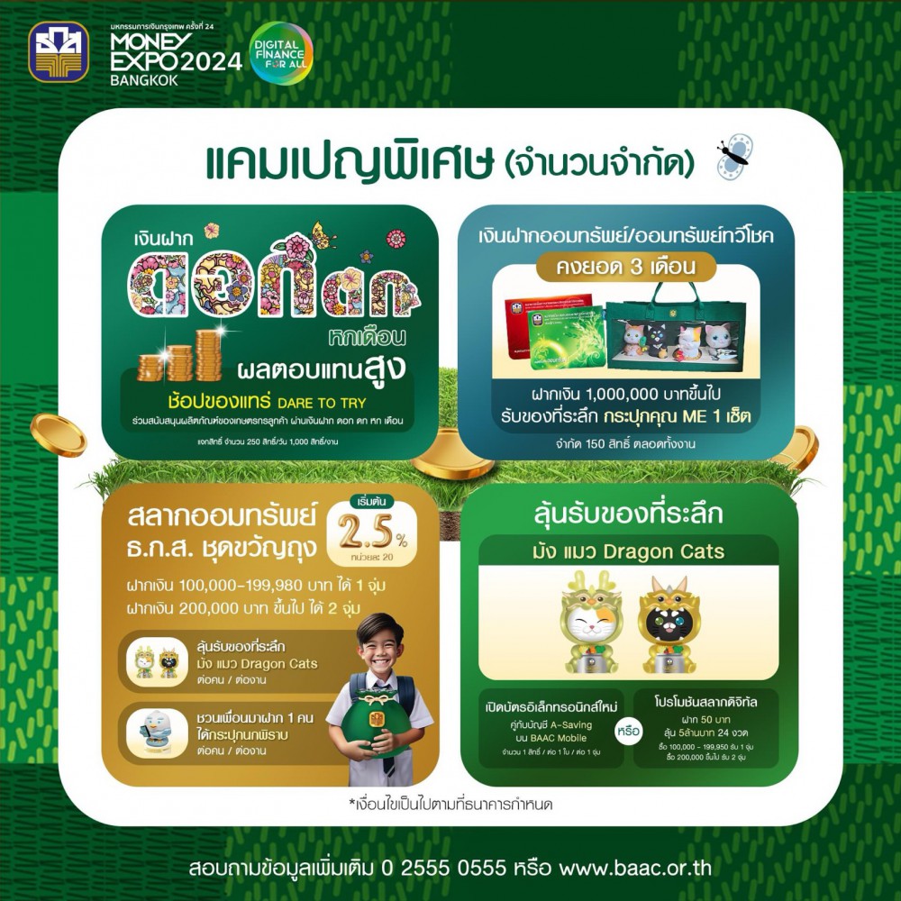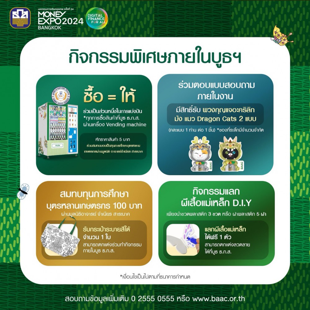 ธ.ก.ส. จัดเต็ม! เปิดตัวอาร์ททอย สุด Exclusive มัง แมว Dragon Cats พร้อมจัดหนักโปรโมชันเงินฝากดอก ดก หก เดือน รับดอกเบี้ยล่วงหน้าทันที และหนุนเยาวชนออมเงินด้วยสลากขวัญถุง หน่วยละ 20 บาท อายุสลาก 6 ปี ครบกำหนดรับดอกเบี้ย 2.50% ต่อปี ลุ้นรับทุนการศึกษาทุกงวดถึง 72 ครั้ง หรือออมกับสลากดิจิทัล หน่วยละ 50 บาท ลุ้นรางวัลที่ 1 มูลค่า 5,000,000 บาท ถึง 24 ครั้ง พิเศษเฉพาะในงาน! เมื่อฝากสลากหรือฝากเงินตามเงื่อนไข รับสิทธิ์จุ่มมัง แมว Dragon Cats ด้านเงินทุน จัดสินเชื่ออัตราดอกเบี้ยพิเศษ ทั้งสินเชื่อ อสม. สินเชื่อ SMEs สินเชื่อธุรกิจชุมชนสร้างไทย พร้อมให้คำปรึกษาด้านการเงินและหนี้นอกระบบ ห้ามพลาดกับการช้อปสินค้าเกษตรสุดพรีเมียมจากผู้ประกอบการเกษตรรุ่นใหม่กว่า 70 รายการ และกิจกรรมลุ้น แลก รับของขวัญมากมาย ที่บูธ ธ.ก.ส. ในงาน Money Expo Bangkok 2024 ณ ชาเลนเจอร์ 2-3 อิมแพ็ค เมืองทองธานี วันที่ 16 – 19 พ.ค. นี้