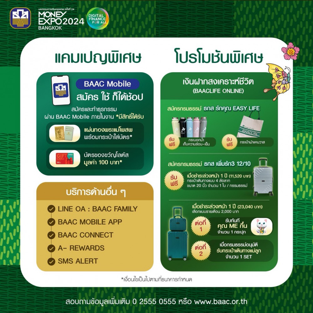 เมื่อเปิดบัญชีหรือฝากเงินบัญชีออมทรัพย์ 58,000 บาทขึ้นไป และคงยอดเงินไว้ 3 เดือน รับสิทธิ์จุ่ม มัง แมว 1 ตัว (1 บัญชี/สิทธิ์ จำกัด 58 สิทธิ์ต่อวัน) หรือเมื่อสมัครใช้ BAAC Mobile และทำธุรกรรมผ่านแอปพลิเคชันภายในงาน มีสิทธิ์ลุ้นรับแผ่นทอง พระแม่โพสพ พร้อมกระเป๋าใส่บัตร หรือบัตรของขวัญโลตัส มูลค่า 100 บาท และเมื่อทำธุรกรรมใดก็ได้ภายในบูธ ครบ 2,000 บาท รับสิทธิ์สุ่มของที่ระลึกมากมาย เช่น มัง แมว Dragon Cats กระเป๋า และสินค้าที่ระลึกสุดพรีเมียม