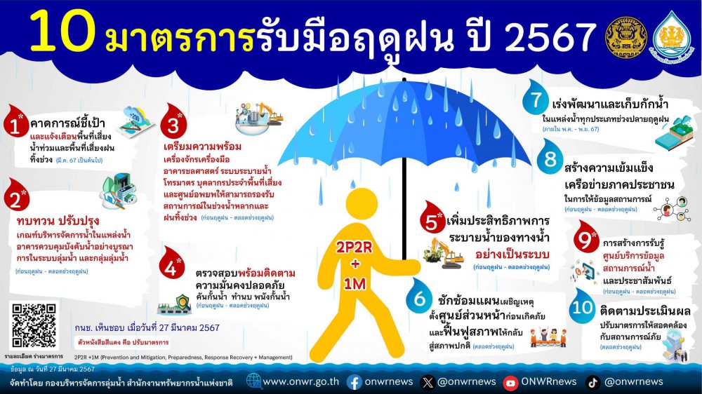 สำหรับ 10 มาตรการรับรับมือฤดูฝน ปี 2567 ได้แก่ 1.คาดการณ์ชี้เป้าและแจ้งเตือนพื้นที่เสี่ยงน้ำท่วมและพื้นที่เสี่ยงฝนทิ้งช่วง 2.ทบทวน ปรับปรุง เกณฑ์บริหารจัดการน้ำในแหล่งน้ำ อาคารควบคุมบังคับน้ำอย่างบูรณาการในระบบลุ่มน้ำและกลุ่มลุ่มน้ำ 3.เตรียมความพร้อมเครื่องจักรเครื่องมือ อาคารชลศาสตร์ ระบบระบายน้ำ โทรมาตร บุคลากรประจำพื้นที่เสี่ยง และศูนย์อพยพให้สามารถรองรับสถานการณ์ในช่วงน้ำหลากและฝนทิ้งช่วง 4.ตรวจสอบพร้อมติดตามความมั่นคงปลอดภัย คันกั้นน้ำ ทำนบ พนังกั้นน้ำ 5.เพิ่มประสิทธิภาพการระบายน้ำของทางน้ำอย่างเป็นระบบ 6.ซักซ้อมแผนเผชิญเหตุตั้งศูนย์ส่วนหน้าก่อนเกิดภัยและฟื้นฟูสภาพให้กลับสู่สภาพปกติ 7.เร่งพัฒนาและเก็บกักน้ำในแหล่งน้ำทุกประเภทช่วงปลายฤดูฝน 8.สร้างความเข้มแข็งเครือข่ายภาคประชาชนในการให้ข้อมูลสถานการณ์ 9.การสร้างการรับรู้ ศูนย์บริการข้อมูลสถานการณ์น้ำและประชาสัมพันธ์ และ 10.ติดตามประเมินผลปรับมาตรการให้สอดคล้องกับสถานการณ์ภัย