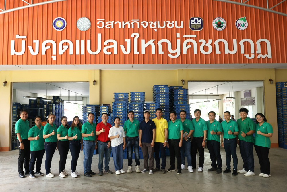 จากนั้น เดินทางไปเยี่ยมชมวิสาหกิจชุมชนมังคุดแปลงใหญ่คิชฌกูฎ ที่เกิดจากการรวมกลุ่มเกษตรกรกว่า 65 รายในพื้นที่กว่า 1,500 ไร่ โดยร่วมกันพัฒนาคุณภาพผลผลิตมังคุด สร้างแบรนด์ KMK เพื่อเพิ่มคุณภาพผลผลิตให้มีมาตรฐานและสามารถกำหนดราคาในการจำหน่ายได้เอง โดยมีการรับซื้อมังคุดจากเกษตรกรในพื้นที่ การจัดตั้งตลาดประมูลมังคุดผ่านทางแอปพลิเคชันไลน์และจำหน่ายต่อไปยังล้งในจังหวัดจันทบุรี