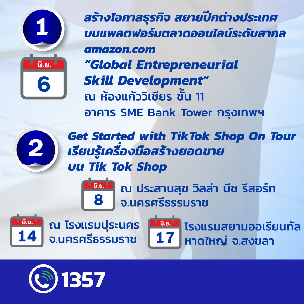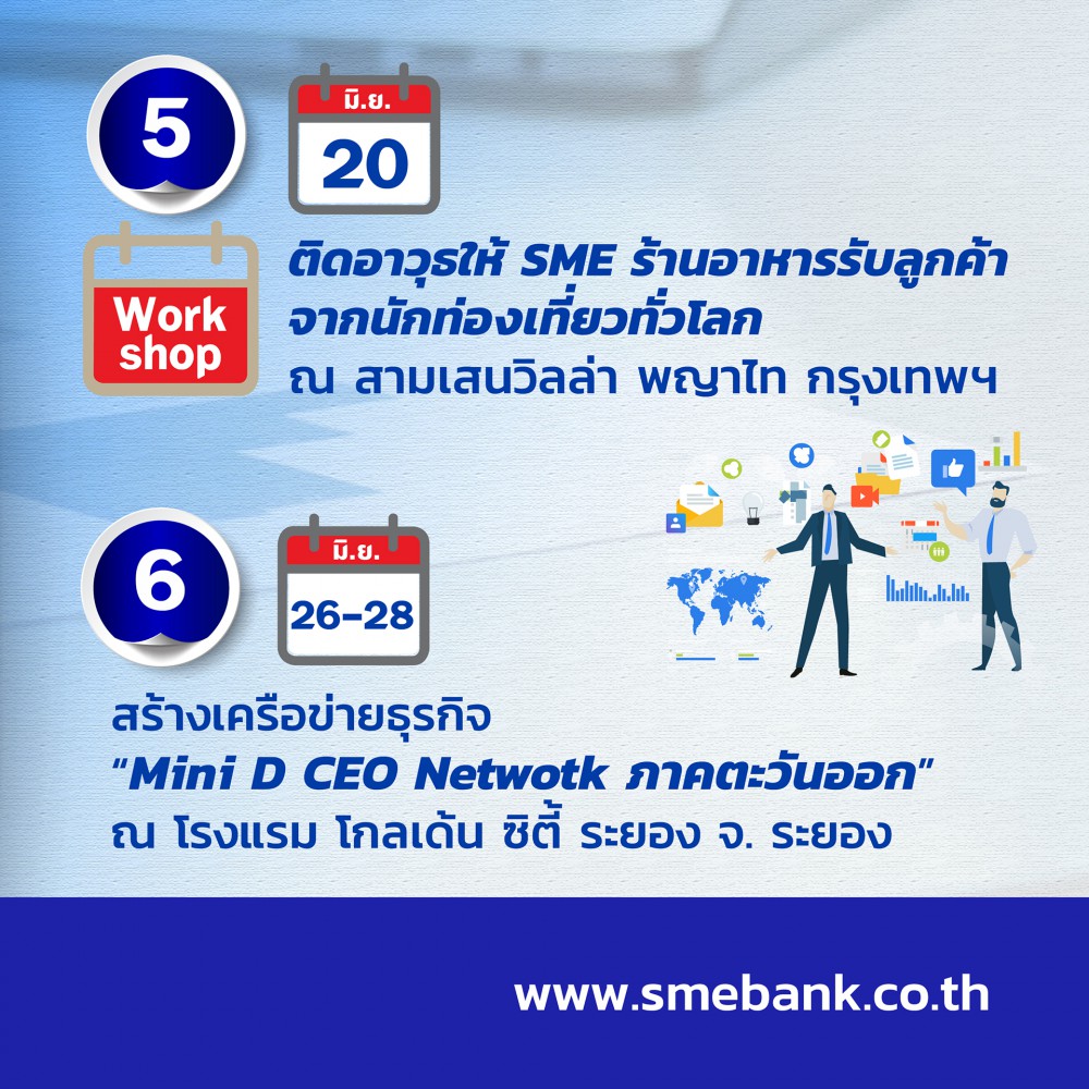 SME D Bank ครบเครื่องเรื่องการพัฒนา เสิร์ฟความรู้สนับสนุนผู้ประกอบการเอสเอ็มอีไทย ยกระดับธุรกิจ ตลอดเดือนมิถุนายน 2567 ผ่าน 18 โปรแกรมสุดพิเศษ ช่วยสร้างโอกาส เพิ่มยอดขาย และดันเข้าถึงแหล่งทุน ทุกโปรแกรมลงทะเบียนสมัครเข้าร่วมได้ฟรี ผ่านแพลตฟอร์ม DX by SME D Bank (https://dx.smebank.co.th/) สอบถามข้อมูลเพิ่มเติม Call Center 1357
