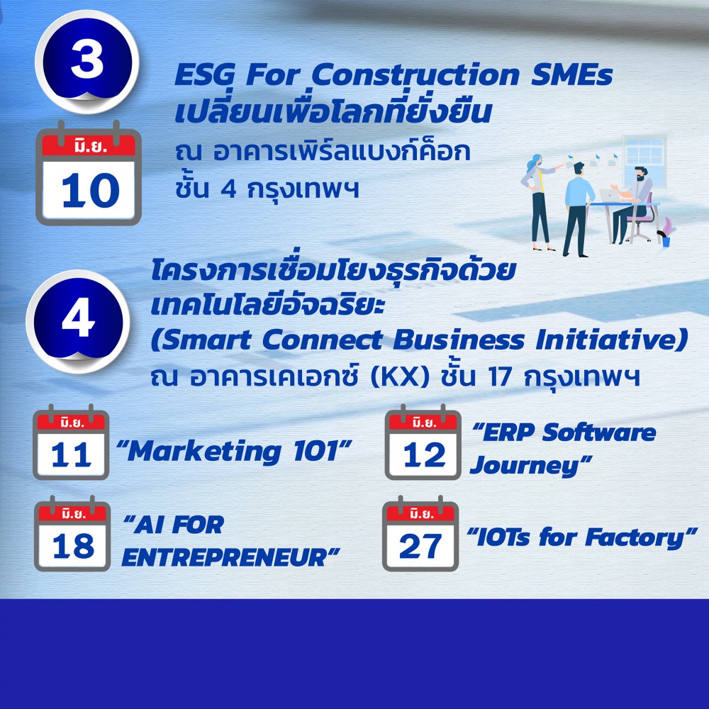 7. สัมมนา “ESG For Construction SMEs เปลี่ยนเพื่อโลกที่ยั่งยืน” พบกับผู้เชี่ยวชาญด้านก่อสร้าง อสังหาริมทรัพย์ และนวัตกรรมสิ่งแวดล้อม นำเสนอแนวคิดใหม่ ทำธุรกิจสู่ความยั่งยืน วันที่ 10 มิ.ย.67 ณ อาคารเพิร์ลแบงก์ค็อก ชั้น 4 กรุงเทพฯ