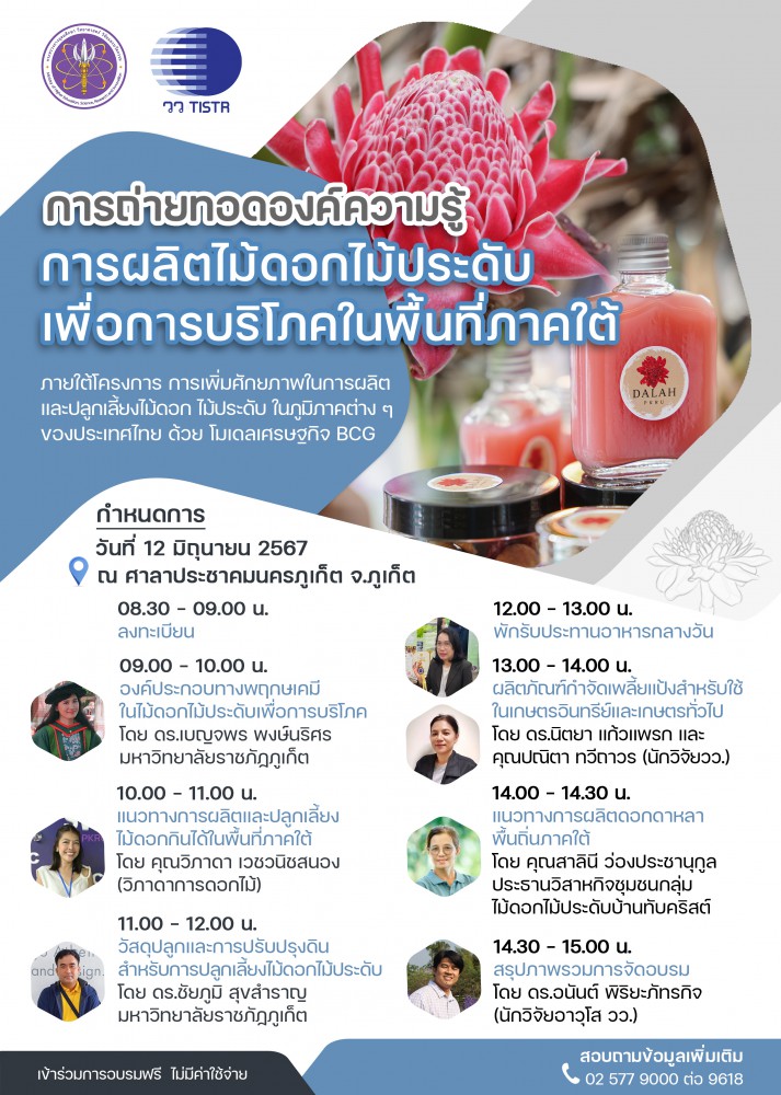 ขอเชิญผู้สนใจเข้าร่วมการอบรมถ่ายทอดองค์ความรู้ ฟรี! ในหัวข้อเรื่อง “การผลิตไม้ดอกไม้ประดับเพื่อการบริโภคในพื้นที่ภาคใต้” จัดโดย ศูนย์เชี่ยวชาญนวัตกรรมเกษตรสร้างสรรค์ วว. ในวันที่ 12 มิถุนายน 2567 เวลา 08.30 – 14.00 น. ณ ศาลาประชาคมนครภูเก็ต จังหวัดภูเก็ต
