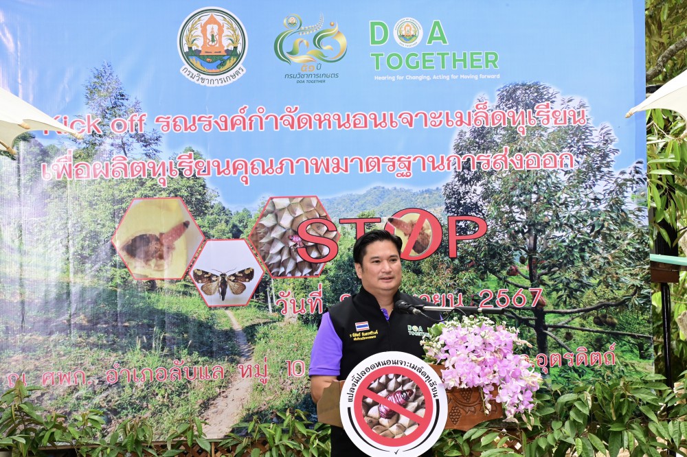 กรมวิชาการเกษตร Kick Off วันถ่ายทอดเทคโนโลยีการผลิตทุเรียนและการป้องกันกำจัดหนอนเจาะเมล็ดทุเรียนที่เมืองลับแล หวังแก้ไขปัญหาหนอนเจาะเมล็ดทุเรียนในพื้นที่ภาคเหนือตอนล่าง เพื่อทำให้ผลผลิตทุเรียนมีคุณภาพตามมาตรฐานการส่งออก และไม่ให้เกิดปัญหาหนอนเจาะเมล็ดทุเรียนติดไปกับผลผลิตทุเรียนทั้งในการบริโภคภายในประเทศ และการส่งออกไปยังประเทศจีน