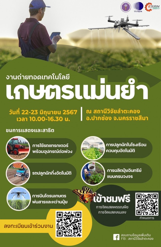 รายงานข่าวจาก สถานีวิจัยลำตะคองสถาบันวิจัยวิทยาศาสตร์และเทคโนโลยีแห่งประเทศไทย (วว.) กระทรวงการอุดมศึกษา วิทยาศาสตร์ วิจัยและนวัตกรรม (อว.) แจ้งว่า ได้ร่วมกับบริษัท คูโบต้าอีสาน จำกัด จัดกิจกรรม “งานถ่ายทอดเทคโนโลยีเกษตรแม่นยำ” ระหว่างวันที่ 22-23 มิถุนายน 2567 เวลา 10.00 – 16.30 น.ณ สถานีวิจัยลำตะคอง อำเภอปากช่อง จังหวัดนครราชสีมา โดยมีเป้าหมายเพื่อส่งเสริมให้เกษตรกรเพิ่มพูนความรู้เกี่ยวกับเทคโนโลยีด้านการเกษตร และยกระดับมาตรฐานการผลิต ในกรอบระบบการจัดการที่ดี สินค้ามีคุณภาพ ลดต้นทุนการผลิต ได้รับความเชื่อถือจากผู้บริโภค สร้างโอกาสเติบโตทางธุรกิจ ทำให้สามารถขยายตลาดได้ทั้งในประเทศและต่างประเทศ