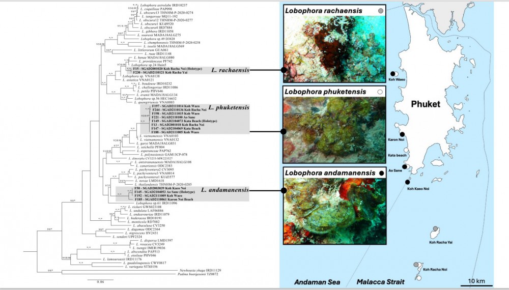ทีมวิจัยประมง คณะประมง มหาวิทยาลัยเกษตรศาสตร์ ค้นพบสาหร่ายชนิดใหม่ในบริเวณจังหวัดภูเก็ต ซึ่งเป็นการค้นพบสาหร่ายทะเลสีน้ำตาลสกุล Lobophora 3 ชนิดใหม่ “Lobophora andamanensis sp. nov.- Lobophora phuketensis sp. nov. – Lobophora rachaensis sp. nov.”บริเวณชายฝั่งทะเลจังหวัดภูเก็ต ด้วยการวิเคราะห์ข้อมูลดีเอ็นเอร่วมกับข้อมูลทางสัณฐานวิทยา และได้รับการตอบรับให้ตีพิมพ์ในวารสารวิชาการระดับนานาชาติ Botanica Marina ในเดือนพฤษภาคม 2567 ที่ผ่านมา