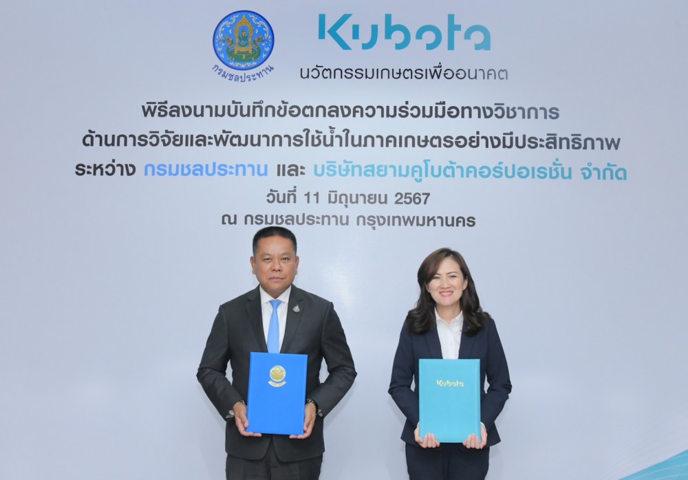 นายชูชาติ รักจิตร อธิบดีกรมชลประทาน และ นางวราภรณ์ โอสถาพันธุ์ กรรมการรองผู้จัดการใหญ่อาวุโส บริษัทสยามคูโบต้าคอร์ปอเรชั่น จำกัด ร่วมลงนามบันทึกข้อตกลงความร่วมมือทางวิชาการ (MOU) “การวิจัยและพัฒนาการใช้น้ำในภาคเกษตรอย่างมีประสิทธิภาพ” ด้วยการนำอุปกรณ์สารสนเทศสำหรับการทดลองในแปลงทดสอบหาค่า Kc (Crop Coefficient) ที่เหมาะสมสำหรับพืชเป้าหมายที่ให้ผลตอบแทนสูงตามนโยบายของกระทรวงเกษตรและสหกรณ์ รวมไปถึงการนำเครื่องจักรกลทางการเกษตรในการทำแปลงปลูกข้าวในรูปแบบเปียกสลับแห้ง เพื่อร่วมกันขับเคลื่อนในพื้นที่สถานีทดลองการใช้น้ำชลประทานที่ 5 (แม่กลองใหญ่) ตำบลทุ่งขวาง อำเภอกำแพงแสน จังหวัดนครปฐม