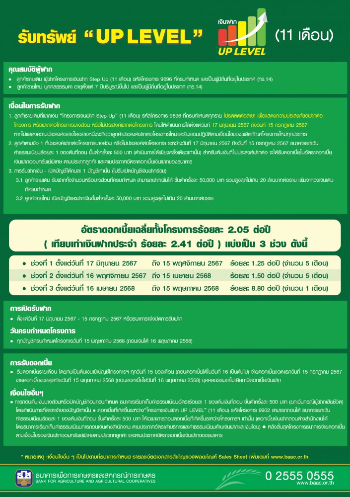 ธ.ก.ส. จัดโครงการเงินฝากออมทรัพย์พิเศษ “UP LEVEL” ฝาก 11 เดือน รับดอกเบี้ยแบบขั้นบันได สูงสุด 8.80% ต่อปี เฉลี่ย 2.05% ต่อปีทั้งโครงการ ฝากขั้นต่ำ 50,000 บาทขึ้นไป รวมสูงสุดไม่เกิน 20 ล้านบาท เปิดรับฝาก 17 มิถุนายน – 15 กรกฎาคมนี้ ที่ ธ.ก.ส. ทุกสาขาทั่วประเทศ