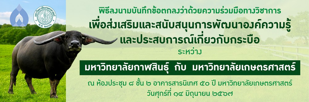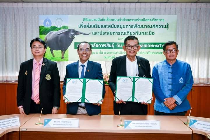 มหาวิทยาลัยเกษตรศาสตร์ ร่วมกับมหาวิทยาลัยกาฬสินธุ์ ได้ลงนามบันทึกข้อตกลงความร่วมมือทางวิชาการว่าด้วยการส่งเสริม สนับสนุนการพัฒนาองค์ความรู้และประสบการณ์เกี่ยวกับกระบือ ประเดิมจากเชิญชวนผู้สนใจร่วมเสวนา เรื่อง “คนค้นควายพลิกโฉมควายไทย” วันศุกร์ที่ 28 มิถุนายน 2567 ในงานมหกรรมการประกวดควายงาม ควายยักษ์ ควายแคระ ชิงถ้วยพระราชทานสมเด็จพระขนิษฐาธิราชเจ้า กรมสมเด็จพระเทพรัตน์ราชสุดาฯ สยามบรมราชกุมารี ณ มหาวิทยาลัยกาฬสินธุ์
