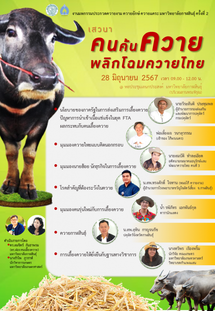ดังนั้นจึงถือโอกาสนี้เชิญชวนผู้สนใจแนวทางการทำธุรกิจเกษตรเกี่ยวกับการเลี้ยงควายทั่วประเทศ ร่วมการเสวนา เรื่อง “คนค้นควายพลิกโฉมควายไทย” ในวันศุกร์ที่ 28 มิถุนายน 2567 เวลา 09.00 -12.00 น. รับชมถ่ายทอดสด online ผ่านเฟซบุ๊กสำนักพัฒนาการเรียนรู้ตลอดชีวิต มหาวิทยาลัยเกษตรศาสตร์ ที่ https://www.facebook.com/llldo และเข้าร่วมงานมหกรรมการประกวดควายงาม ควายยักษ์ ควายแคระ ชิงถ้วยพระราชทานสมเด็จพระขนิษฐาธิราชเจ้า กรมสมเด็จพระเทพรัตน์ราชสุดาฯ สยามบรมราชกุมารี ระหว่างวันที่ 28 -30 มิถุนายน 2567 ณ มหาวิทยาลัยกาฬสินธุ์ ด้วย