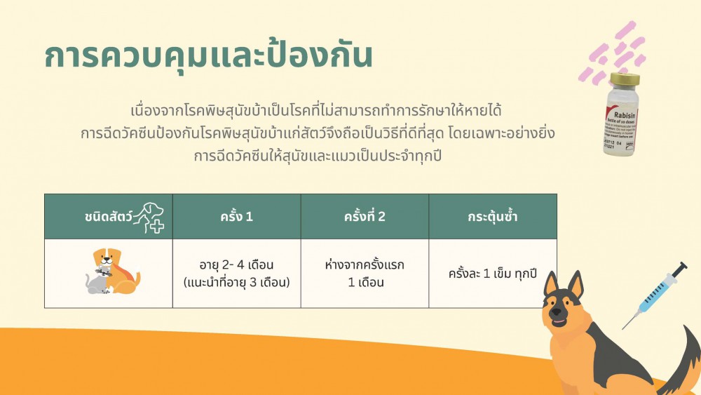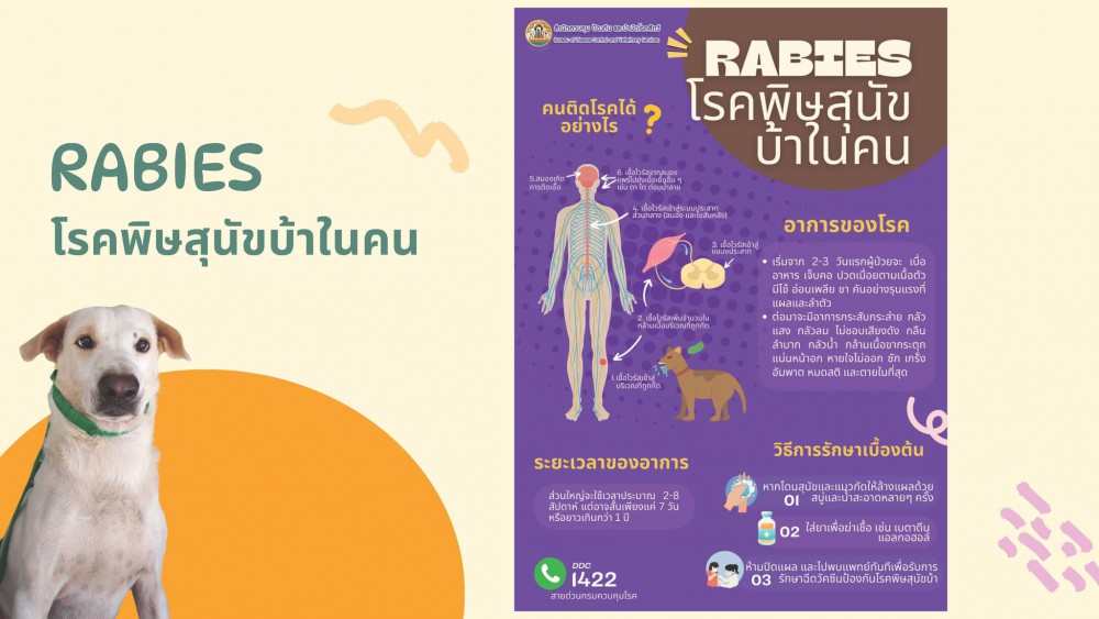 ทั้งนี้โรคพิษสุนัขบ้า หรือโรคกลัวน้ำ บางพื้นที่เรียกว่า โรคหมาว้อ เกิดจากเชื้อไวรัสพิษสุนัขบ้า หรือเรบีส์ไวรัส (Rabies Virus) เป็นโรคติดเชื้อของระบบประสาทส่วนกลางที่มีอันตรายร้ายแรงถึงชีวิต หากเชื้อเข้าสู่ร่างกายแล้ว เสียชีวิตสถานเดียว เนื่องจากไม่มียารักษา ซึ่งโรคนี้ไม่ได้เกิดกับสุนัขเพียงอย่างเดียว แต่สามารถเกิดได้กับสัตว์เลี้ยงลูกด้วยนมทุกช่วงอายุและทุกชนิด ทั้งสัตว์เลี้ยงและสัตว์ป่า ไม่ว่าจะเป็น สุนัข แมว โค กระบือ แพะ แกะ กระต่าย หนู ค้างคาว สุนัขจิ้งจอก แรคคูน ลิง ชะนี กระรอก เป็นต้น พาหะนำเชื้อใกล้ตัวที่สำคัญ คือ สุนัข แมว และที่สำคัญโรคพิษสุนัขบ้านี้ แพร่เชื้อจากสัตว์สู่สัตว์หรือไปสู่คนผ่านทางน้ำลาย และสามารถติดโรคนี้ได้ในทุกฤดูไม่ใช่แค่หน้าร้อนเท่านั้น การฉีดวัคซีนป้องกันโรคพิษสุนัขแก่สัตว์จึงถือเป็นวิธีที่ดีที่สุด โดยเฉพาะอย่างยิ่งการฉีดวัคซีนให้สุนัขและแมวเป็นประจำ โดยครั้งแรกควรฉีดวัคซีนในช่วงอายุ 2-4 เดือน ครั้งที่ 2 ฉีดวัคซีนให้ห่างจากครั้งแรก 1 เดือน และกระตุ้นซ้ำ ครั้งละ 1 เข็ม ทุกปี