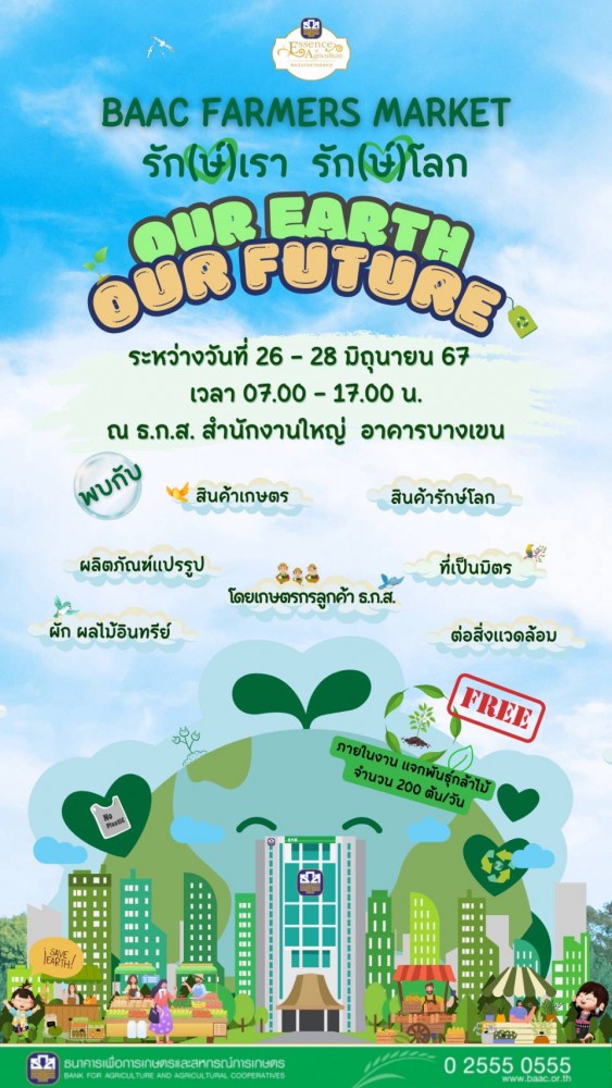 ธ.ก.ส.ร่วมกับเกษตรกรหัวขบวนนำทัพสินค้าเกษตร ผัก ผลไม้อินทรีย์ ผลิตภัณฑ์แปรรูป รวมทั้งสินค้ารักษ์โลก ที่เป็นมิตรต่อสิ่งแวดล้อม ส่งตรงจากฟาร์มเกษตรกรมาให้เลือกชม ชิม ช้อป ในงาน ตลาดนัดของดี วิถีชุมชนลูกค้า ธ.ก.ส. ประจำเดือนมิถุนายน 2567 ภายใต้Theme “รัก(ษ์)เรา รัก(ษ์)โลก Our Earth Our Future” พร้อมแจกพันธุ์กล้าต้นไม้นานาพันธุ์ กว่า 200 ต้น/วัน ระหว่างวันที่ 26-28 มิถุนายน นี้ ณ บริเวณด้านหน้า ธ.ก.ส. สำนักงานใหญ่ กรุงเทพมหานคร