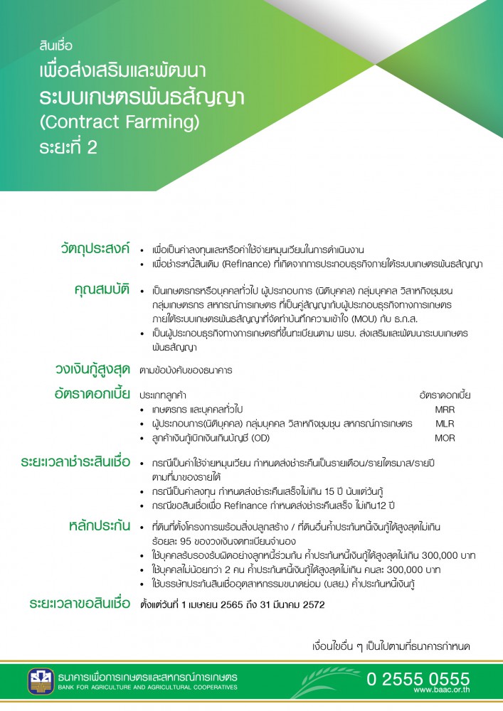 ธ.ก.ส. เดินหน้าสินเชื่อเพื่อส่งเสริมและพัฒนาระบบเกษตรพันธสัญญา (Contract Farming) ระยะที่ 2 วงเงินรวม 1.5 หมื่นล้านบาท หนุนเกษตรกรและผู้ประกอบการธุรกิจเกษตร นำไปเป็นค่าใช้จ่ายหมุนเวียนและลงทุนในการยกระดับการผลิตให้มีคุณภาพและได้มาตรฐาน รวมถึงใช้ชำระหนี้เดิมที่เกิดจากการประกอบธุรกิจ สนใจแจ้งความประสงค์และสอบถามเพิ่มเติมที่ ธ.ก.ส. ทุกสาขาทั่วประเทศ ตั้งแต่วันนี้ถึง 31 มีนาคม 2572