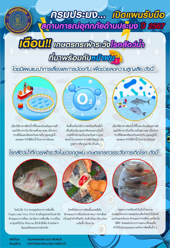 สำหรับโรคสัตว์น้ำที่ควรเฝ้าระวังในช่วงฤดูฝน เกษตรกรควรระวังการเกิดโรค ดังต่อไปนี้1. โรคไวรัส TiLV สาเหตุเกิดจากการติดเชื้อ Tilapia Lake Virus (TiLV) ส่วนใหญ่จะพบในปลานิล ลักษณะอาการ ที่พบ ปลามีอาการเซื่องซึม ปากเปื่อย ตาขุ่นหรือโปน ท้องบวม มีลำตัวสีเข้ม ผิวหนังด่าง มีแผลเลือดออกตามผิวหนัง กินอาหารน้อยหรือไม่กินอาหาร และจะทยอยตายในอัตราที่สูงถึง 50-100% โรคนี้ไม่สามารถรักษาได้ด้วยการใช้ยาหรือสารเคมี แต่ป้องกันโดย คัดเลือกลูกพันธุ์จากแหล่งเพาะพันธุ์ที่น่าเชื่อถือ ไม่มีประวัติการระบาดโรค และในระหว่างการเลี้ยงควรให้อาหารในปริมาณที่เหมาะสมตามช่วงอายุของปลา เพื่อลดของเสียและสิ่งขับถ่ายสะสมในบ่อ