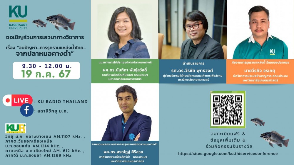 มหาวิทยาลัยเกษตรศาสตร์ จัดการเสวนาทางวิชาการ“จบปัญหา…การรุกรานแหล่งน้ำไทย…จากปลาหมอคางดำ” วันศุกร์ที่ 19 กรกฎาคม 2567 ในระบบออนไลน์ผ่านทาง Facebook : สถานีวิทยุ ม.ก. , You Tube : KU Radio Thailand