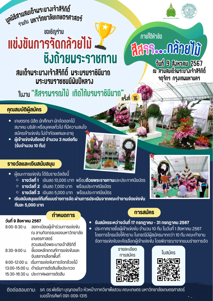 มหาวิทยาลัยเกษตรศาสตร์ ร่วมกับมูลนิธิสวนสมเด็จพระนางเจ้าสิริกิติ์ ขอเชิญร่วมแข่งขันการจัดกล้วยไม้ ชิงถ้วยพระราชทานสมเด็จพระนางเจ้าสิริกิติ์ พระบรมราชินีนาถ พระบรมราชชนนีพันปีหลวง ในงาน “สีสรรพรรณไม้ เทิดไท้บรมราชินีนาถ” ครั้งที่ 16 ณ สวนสมเด็จพระนางเจ้าสิริกิติ์ จตุจักร กรุงเทพมหานคร วันที่ 9 สิงหาคม 2567 ภายใต้หัวข้อ “สีสรร…กล้วยไม้”