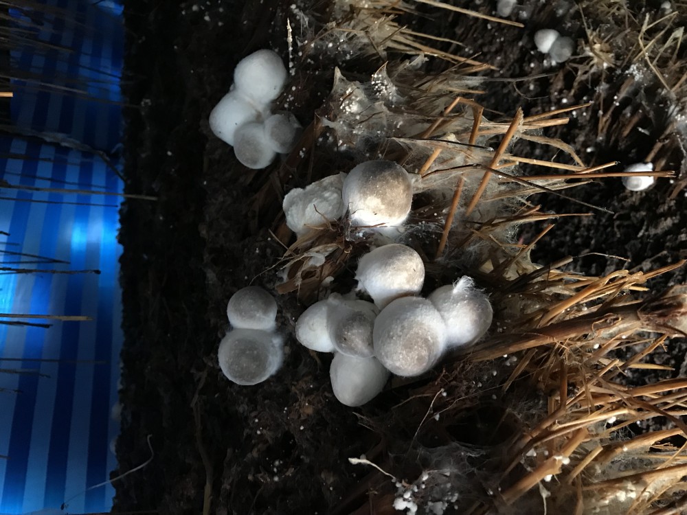 ลักษณะดอกตูมเป็นทรงน้ำเต้า ฐานกว้างขนาด 11 – 58 มิลลิเมตร ยาว 14 – 58 มิลลิเมตร ดอกสีน้ำตาลอ่อนถึงเทาอมดำอ่อน ขนาดและรูปร่างของดอกตรงตามเกณฑ์มาตรฐานสินค้าเกษตรของเห็ดฟาง (มกษ. 1515-2558) เริ่มเก็บผลผลิตได้หลังลดอุณหภูมิในโรงเรือนลงประมาณ 7 วัน และใน 1 รอบการผลิต มีระยะเวลาการเก็บผลผลิตได้นาน 2 – 3 สัปดาห์