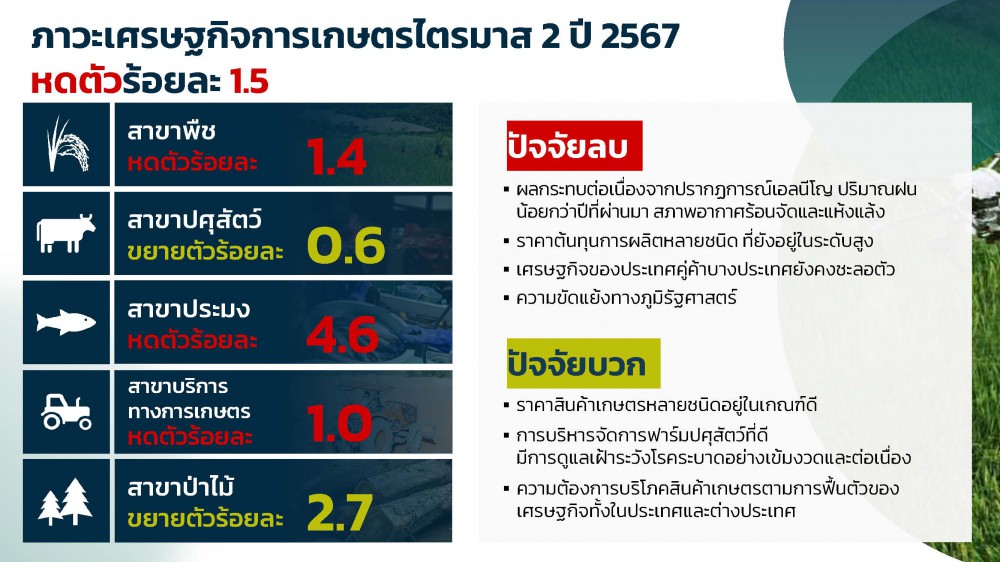 นายฉันทานนท์ วรรณเขจร เลขาธิการสำนักงานเศรษฐกิจการเกษตร (สศก.) กระทรวงเกษตรและสหกรณ์ เปิดเผยถึงภาวะเศรษฐกิจการเกษตรในไตรมาส 2 ปี 2567 (เมษายน – มิถุนายน 2567) หดตัวร้อยละ 1.5 เมื่อเทียบกับช่วงเดียวกันของปี 2566 โดยในไตรมาส 2 ยังคงได้รับผลกระทบต่อเนื่องจากปรากฏการณ์เอลนีโญ ทำให้ปริมาณฝนน้อยกว่าปีที่ผ่านมา สภาพอากาศร้อนจัดและแห้งแล้ง ส่งผลกระทบต่อการเพาะปลูกและการเจริญเติบโตของพืช เกษตรกรบางส่วนงดหรือปรับเปลี่ยนการเพาะปลูก ส่งผลให้สาขาพืชซึ่งเป็นสาขาการผลิตหลักยังคงหดตัวต่อเนื่องจากไตรมาสแรก ทำให้สาขาบริการทางการเกษตรหดตัวตามไปด้วย ขณะที่สาขาประมงหดตัวเช่นเดียวกัน เนื่องจากการลดหรือชะลอการเลี้ยงจากภาวะต้นทุนที่ยังอยู่ในระดับสูง ขณะที่สาขาปศุสัตว์และสาขาป่าไม้ ยังขยายตัวได้ สำหรับรายละเอียดในแต่ละสาขา พบว่า