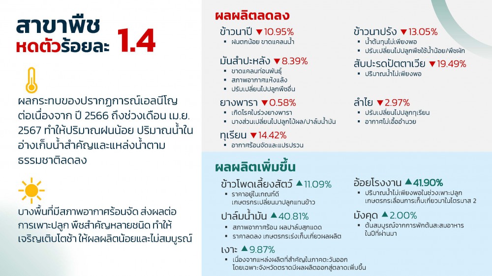 สาขาพืช หดตัวร้อยละ 1.4 เมื่อเทียบกับช่วงเดียวกันของปี 2566 จากผลกระทบของเอลนีโญที่เกิดขึ้นต่อเนื่อง จากปี 2566 มาจนถึงช่วงเมษายน 2567 ทำให้มีปริมาณฝนน้อยกว่าปีที่ผ่านมา ปริมาณน้ำในอ่างเก็บน้ำสำคัญและแหล่งน้ำตามธรรมชาติลดลง บางพื้นที่ประสบปัญหาสภาพอากาศร้อนจัด ทำให้พืชเจริญเติบโตช้า ให้ผลผลิตน้อยและไม่สมบูรณ์