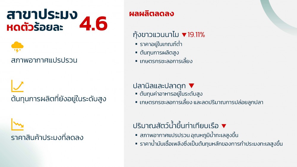 สาขาประมง หดตัวร้อยละ 4.6 โดยสินค้าประมงที่มีผลผลิตลดลง ได้แก่ กุ้งขาวแวนนาไม ผลผลิตลดลง เนื่องจากราคากุ้งตกต่ำอย่างต่อเนื่อง ประกอบกับต้นทุนการผลิตที่อยู่ในระดับสูง ส่งผลให้เกษตรกรลดพื้นที่การเพาะเลี้ยงและชะลอการปล่อยลูกกุ้ง