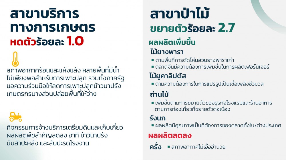สาขาป่าไม้ ขยายตัวร้อยละ 2.7 โดยไม้ยางพาราเพิ่มขึ้นตามพื้นที่การตัดโค่นสวนยางพาราเก่าและปลูกทดแทนด้วยยางพาราพันธุ์ดีหรือพืชเศรษฐกิจอื่น ประกอบกับตลาดจีนมีความต้องการเพิ่มขึ้นเพื่อใช้ในการผลิตเฟอร์นิเจอร์ ส่วนไม้ยูคาลิปตัสเพิ่มขึ้นตามความต้องการใช้ในการแปรรูปเป็นเชื้อเพลิงชีวมวล (wood pellet) เพื่อส่งออกไปยังตลาดญี่ปุ่นและเกาหลีใต้ ถ่านไม้ เพิ่มขึ้นเนื่องจากความต้องการใช้ที่เพิ่มขึ้นของธุรกิจโรงแรมและร้านอาหารตามการท่องเที่ยวที่ขยายตัวอย่างต่อเนื่อง และรังนกเพิ่มขึ้น เนื่องจากรังนกของไทยมีคุณภาพสูง เป็นที่ต้องการของอุตสาหกรรมแปรรูปรังนกทั้งภายในประเทศและต่างประเทศ ขณะที่ ครั่ง ลดลงเนื่องจากสภาพอากาศที่ร้อนจัดในช่วงที่ผ่านมา ไม่เอื้ออำนวยต่อการเจริญเติบโตของครั่ง รวมถึงมีการส่งออกไปยังประเทศอินเดียลดลง
