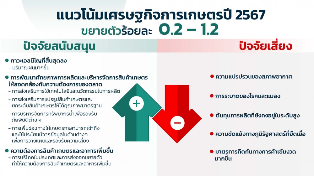 ทั้งนี้ แนวโน้มเศรษฐกิจการเกษตรในปี 2567 คาดว่าจะขยายตัวอยู่ในช่วงร้อยละ 0.2 – 1.2 เมื่อเทียบกับปี 2566 โดยมีปัจจัยสนับสนุน คือ ภาวะเอลนีโญที่สิ้นสุดลง ทำให้มีปริมาณฝนมากขึ้นในช่วงครึ่งหลังของปีนี้ ประกอบกับการดำเนินนโยบายในการพัฒนาศักยภาพการผลิตและบริหารจัดการสินค้าเกษตรให้สอดคล้องกับความต้องการของตลาด การส่งเสริมการใช้เทคโนโลยีและนวัตกรรมในการผลิตและการแปรรูปสินค้าเกษตร การยกระดับสินค้าเกษตรให้มีคุณภาพและได้มาตรฐาน การบริหารจัดการทรัพยากรน้ำเพื่อรองรับภัยพิบัติต่าง ๆ ตลอดจนการเพิ่มช่องทางให้เกษตรกรสามารถเข้าถึงและใช้ประโยชน์ข้อมูลด้านต่าง ๆ เพื่อการวางแผนและรองรับความเสี่ยง