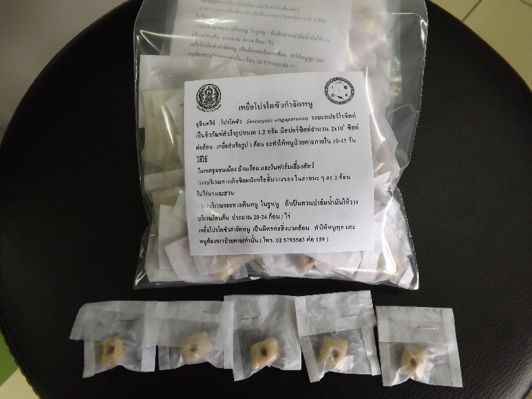 การใช้เหยื่อโปรโตซัวกำจัดหนู โดยเหยื่อโปรโตซัว เป็นสารชีวินทรีย์กำจัดหนู โดยใช้ปรสิตโปรโตซัว Sarcocystis singaporensis ที่พบเฉพาะในหนูและงูเหลือม มีการขยายพันธุ์แบบไม่มีเพศ บริเวณเซลล์บุผิวภายในหลอดเลือดของหนู และสุดท้ายสร้างเป็นซีสต์ ตามกล้ามเนื้อลำตัว เมื่องูเหลือมกินหนูติดเชื้อ โปรโตซัวจะขยายพันธุ์แบบอาศัยเพศบริเวณเซลล์ผนังของลำไส้ และผลิตสปอร์โรซีสต์ ซึ่งเป็นระยะสุดท้ายของการเจริญเติบโต และถูกขับถ่ายปะปนออกมาพร้อมมูลงู
