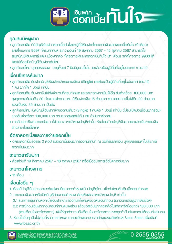 โดยผู้ที่สนใจสามารถเปิดบัญชีเงินฝากดอกเบี้ยทันใจ ฝากขั้นต่ำครั้งละ 100,000 บาท และสามารถฝากเพิ่มได้ ครั้งละ 100,000 บาทขึ้นไป รวมสูงสุดไม่เกิน 20,000,000 บาทต่อราย ระยะเวลา 11 เดือน พร้อมรับดอกเบี้ยทันที ณ วันฝาก ร้อยละ 2 ต่อปี (เทียบเท่าเงินฝากประจำ ร้อยละ 2.35 ต่อปี) โดยเปิดรับฝากตั้งแต่วันที่ 19 สิงหาคม – 18 ตุลาคม 2567 หรือจนกว่าธนาคารแจ้งปิดการรับฝาก