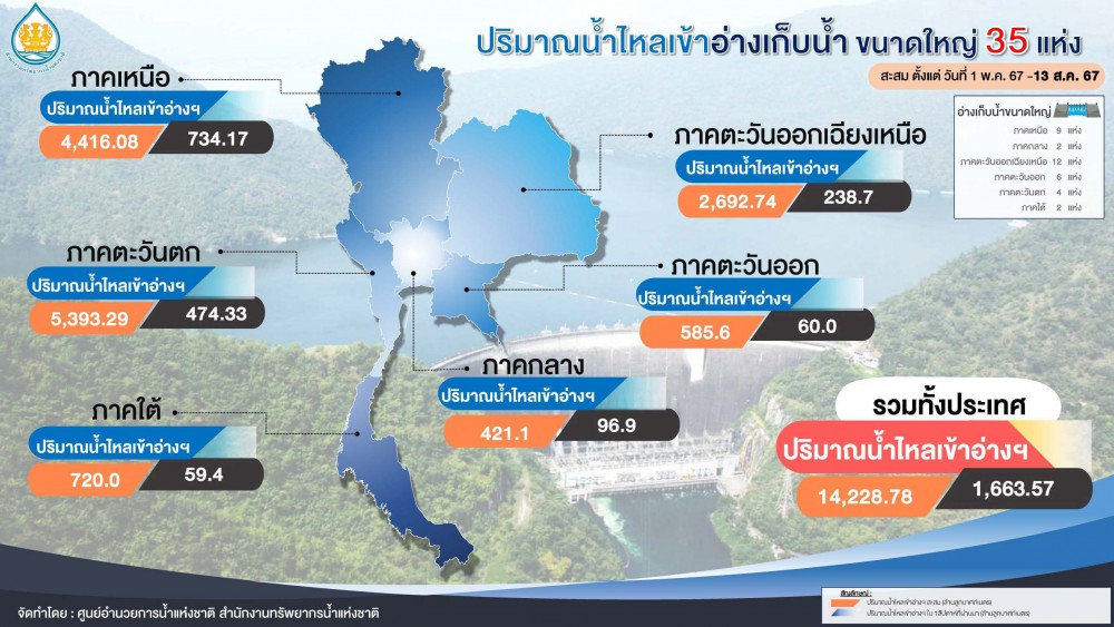 วันที่14 สิงหาคม 2567 ดร.สุรสีห์ กิตติมณฑล เลขาธิการสำนักงานทรัพยากรน้ำแห่งชาติ (สทนช.) เปิดภายหลังเป็นประธานการประชุมติดตามและประเมินสถานการณ์น้ำประจำสัปดาห์ ร่วมกับหน่วยงานที่เกี่ยวข้อง ณ ห้องประชุมน้ำปิง สทนช. และผ่านสื่ออิเล็กทรอนิกส์ ว่า จากสถานการณ์ฝนตกหนักในช่วงวันที่ 5-14 ส.ค. 67 ที่ผ่านมา ส่งผลให้เกิดอุทกภัยใน 16 จังหวัด ได้แก่ ภาคเหนือ 7 จังหวัด ภาคตะวันออกเฉียงเหนือ 2 จังหวัด ภาคกลาง 2 จังหวัด ภาคตะวันออก 2 จังหวัด และภาคใต้ 3 จังหวัด