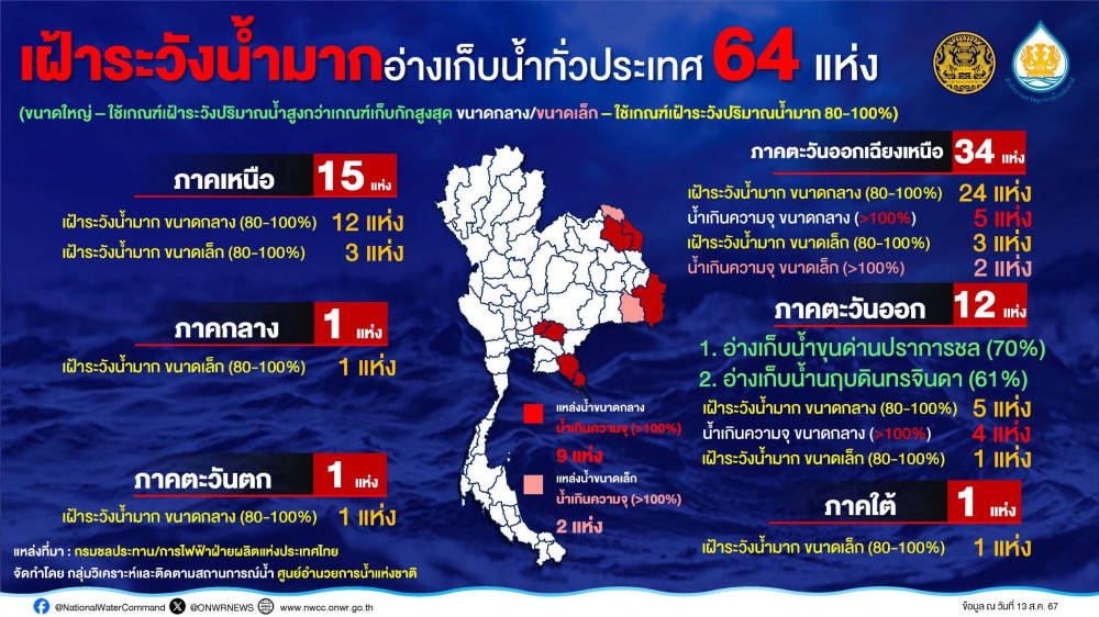 เพื่อให้สามารถวางแผนบริหารจัดการน้ำได้อย่างสมดุล นอกจากนี้ ยังได้กำชับให้ทุกหน่วยงานปฏิบัติตาม 10 มาตรการฤดูฝน ปี 67 อย่างเคร่งครัด เร่งสำรวจจุดเปราะบางแนวคันกั้นน้ำ ซ่อมแซมอาคารชลศาสตร์และเตรียมเครื่องจักรเครื่องมือให้มีความพร้อมใช้งาน พร้อมเฝ้าระวังอ่างเก็บน้ำ 64 แห่ง ที่ปริมาณน้ำสูงกว่าเกณฑ์เก็บกักสูงสุด เร่งพร่องน้ำเพิ่มพื้นที่กักเก็บน้ำรองรับสถานการณ์ฝนในช่วงปลาย ส.ค.-ก.ย.นี้