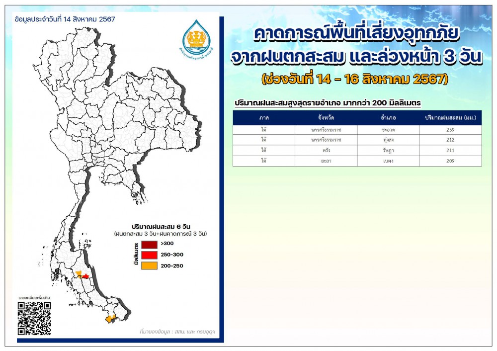 ปัจจุบันยังคงมีพื้นที่ประสบอุทกภัย 4 จังหวัด ได้แก่ จ.แม่ฮ่องสอน เชียงราย ลำปาง และปราจีนบุรี สำหรับการคาดการณ์พื้นที่เสี่ยงอุทกภัยจากปริมาณฝนตกสะสมสูงสุดรายอำเภอ มากกว่า 200 มิลลิเมตร ช่วงวันที่ 14-16 ส.ค. 67 ได้แก่ อ.ชะอวด อ.ทุ่งสง จ.นครศรีธรรมราช , อ.รัษฎา จ.ตรัง และ อ.เบตง จ.ยะลา โดย สทนช. ยังคงเฝ้าระวังสถานการณ์อย่างใกล้ชิด เนื่องจากคาดการณ์ว่าในช่วงวันที่ 16–22 ส.ค. 67 จะมีปริมาณฝนเพิ่มขึ้นและมีฝนตกหนักบางแห่ง จึงได้ออกประกาศ สทนช. ฉบับที่ 10/2567 แจ้งเตือนเฝ้าระวังน้ำท่วมฉับพลันและน้ำป่าไหลหลาก บริเวณภาคเหนือ ภาคตะวันออกเฉียงเหนือตอนบน และภาคตะวันออก เพื่อให้หน่วยงานที่เกี่ยวข้อง เตรียมความพร้อมรับมือเป็นการล่วงหน้า